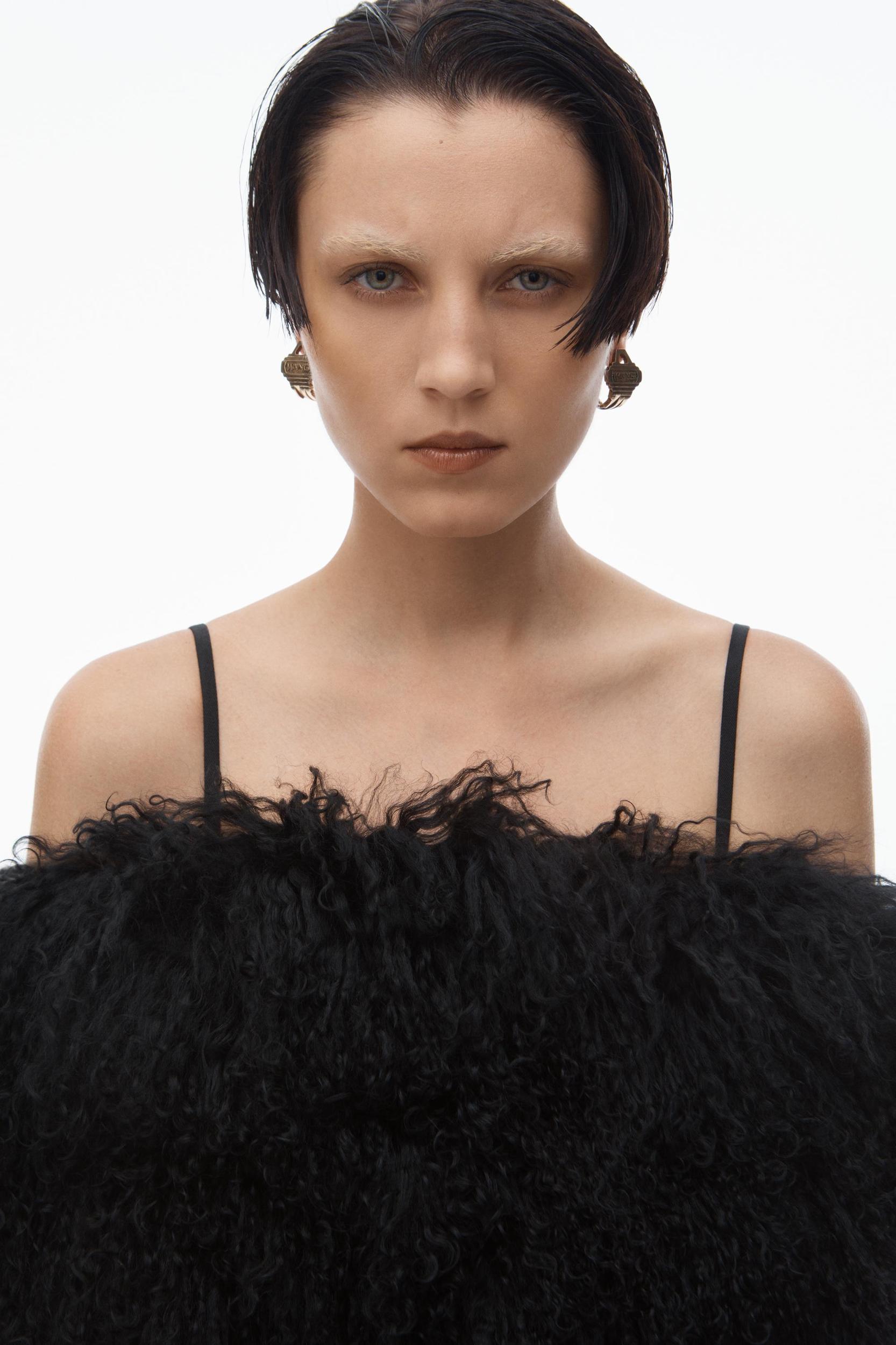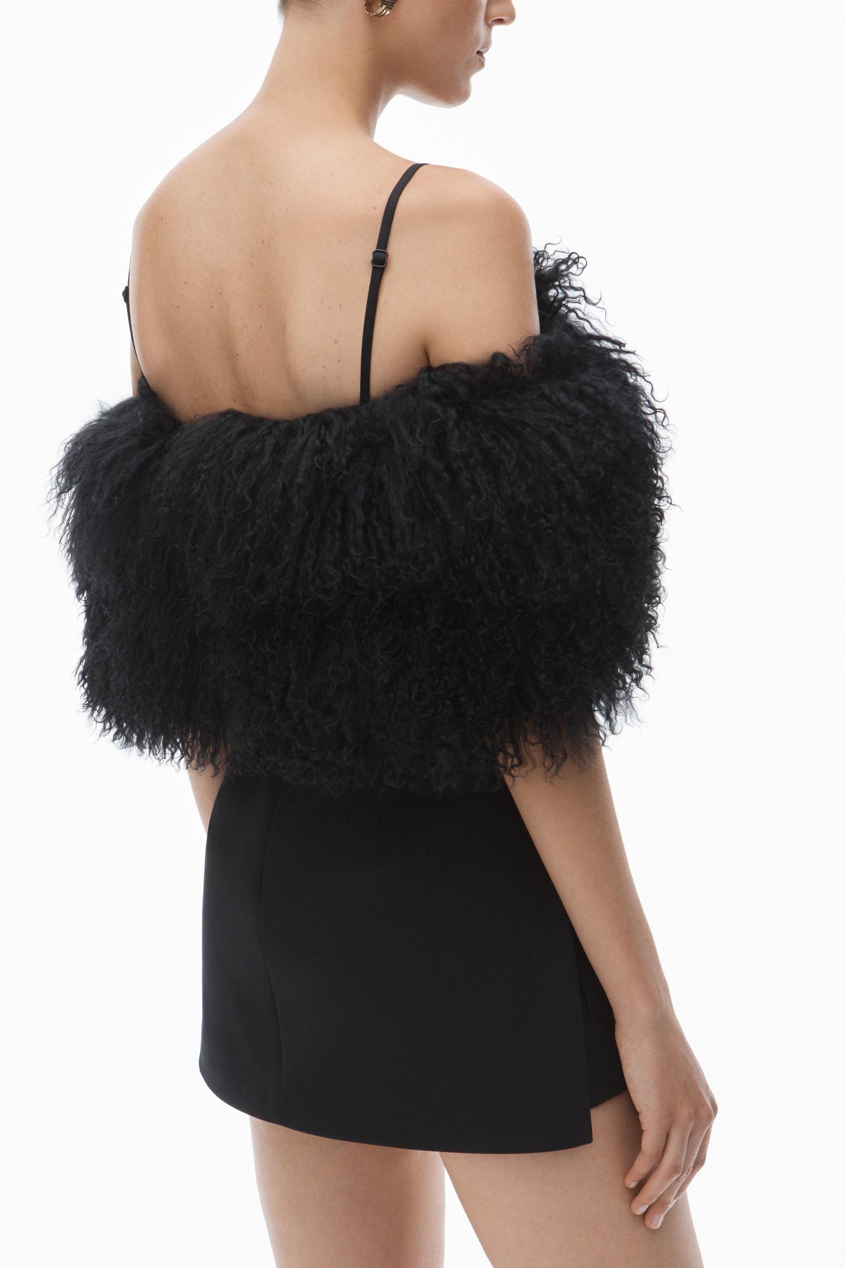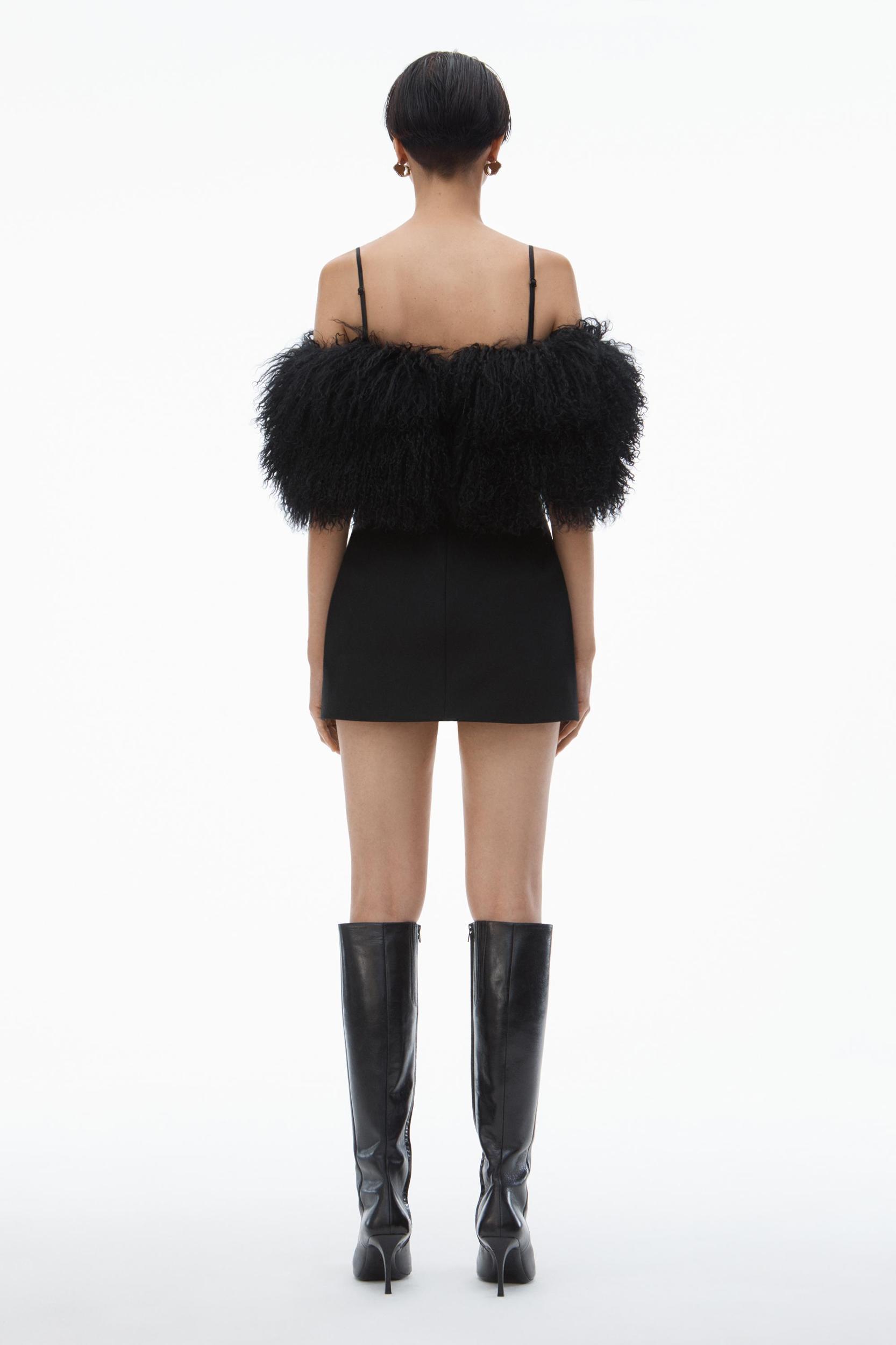 A detachable mongolian lamb shearling stole elevates this black minidress. It has removable straps for a bandeau look and an internal short for added comfort.