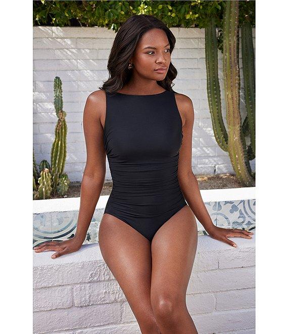 From Miraclesuit, this one piece features: Miratex fabric provides allover body control, shapes and slims High neck Minimizes and slims bust Soft cups Cleverly draped fabric conceals tummy Pull-on construction Nylon/spandex Hand wash Imported.