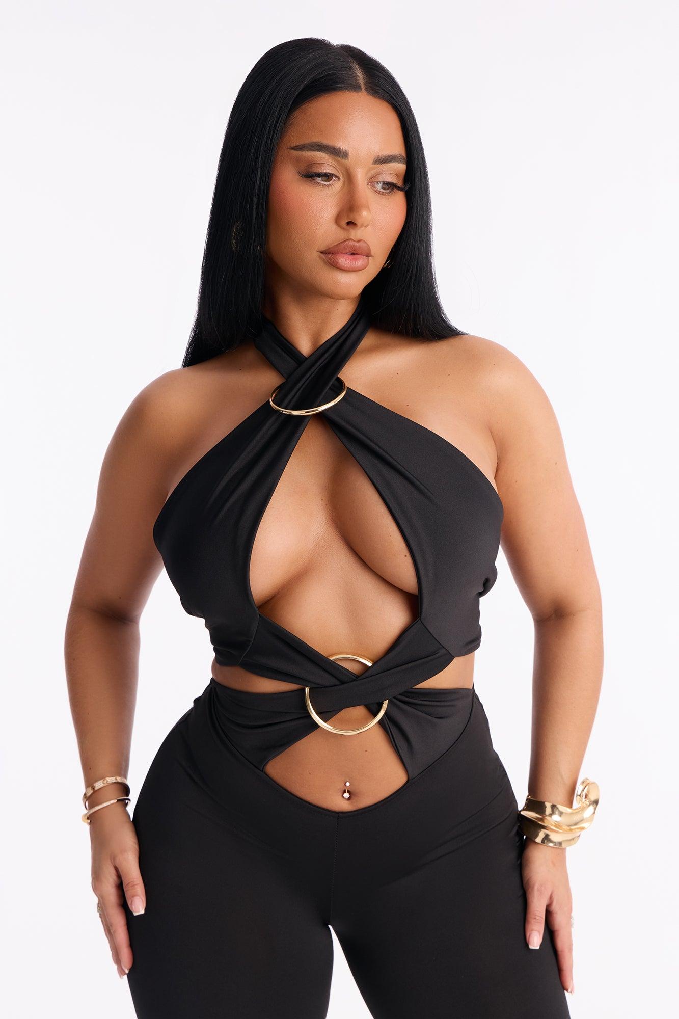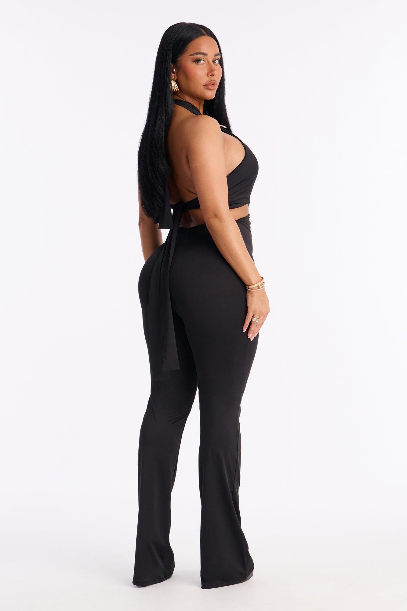 Available In Black. Jumpsuit Stretch Halter Flare Leg Elastic Waistband Tie Neck And Back Closure Hardware Detail 35" Inseam Self: 80% Polyester 20% Spandex Imported California Proposition 65WARNING: Cancer and Reproductive Harm - www.P65Warnings.ca.gov.