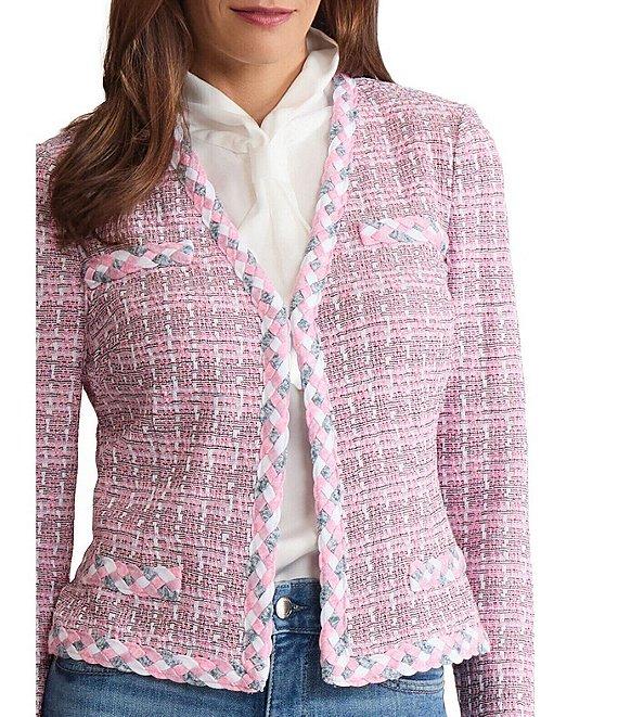 From MISOOK, this jacket features: Tweed knit fabrication V-neckline Long sleeves Soft shoulder pads Braided trim Tailored silhouette Faux front pockets Straight hem Hook front closure Approx. 21" length Acrylic/nylon; trim: acrylic/polyester Hand wash Imported.