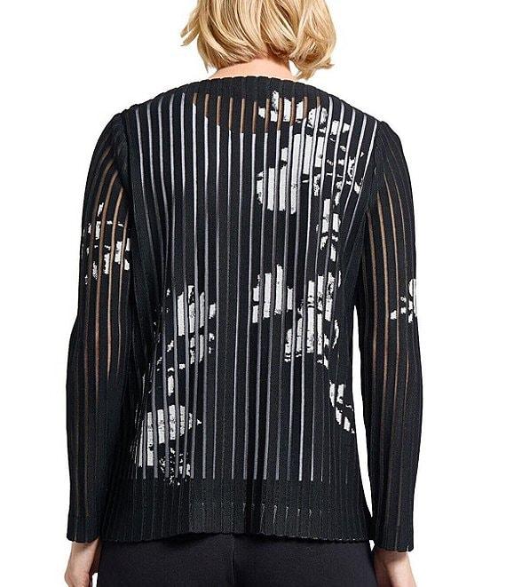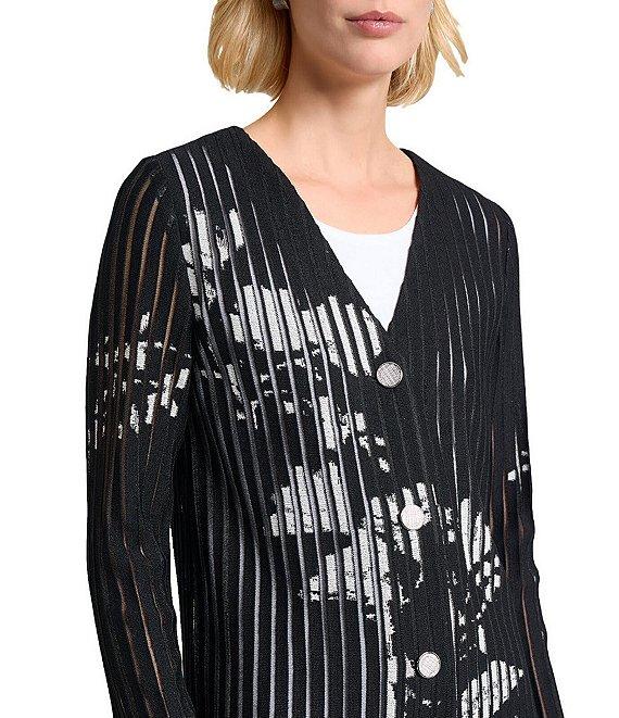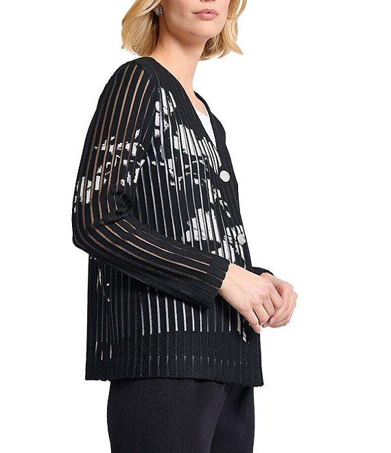 From MISOOK, this jacket features: Sheer striped soft knit fabrication Floral print V-neckline Long sleeves Straight hem Button front closure Approx. 26" length Rayon/polyester/nylon Hand wash Imported.