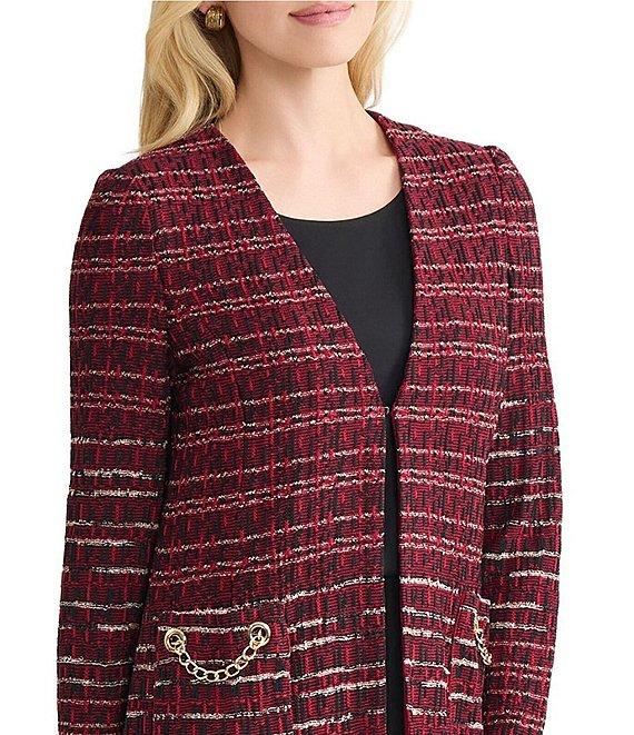 From MISOOK, this cardigan features: Multi-stitch knit fabrication V-neckline Long sleeves Shoulder pads Front patch packets Chain details Straight hem Hook front closure Approx. 32" length Acrylic/nylon/rayon Hand wash Imported.