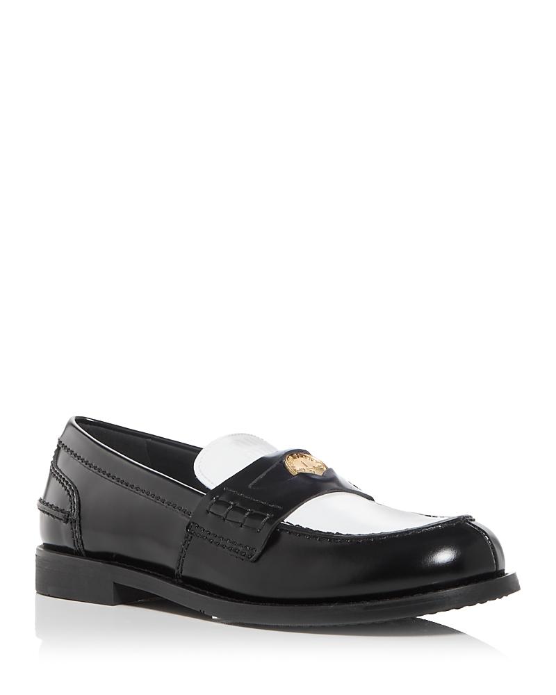 Inspired by the 1950s, Miu Mius loafers are designed with a penny in the vamp strap. This Italian-made pair is finished with a signature embossed logo on the tongue. 100% calf leather upper Round toe Slip-on style Rubber sole Made in Italy SIZE Block heel, 0.75 (20mm). Womens Shoes - Miu Miu Womens Shoes > Miu Miu > Saks Fifth Avenue > Barneys. Miu Miu. Color: Nero Bianco. Size: 10.