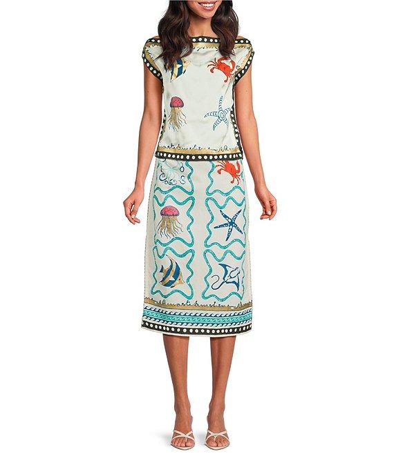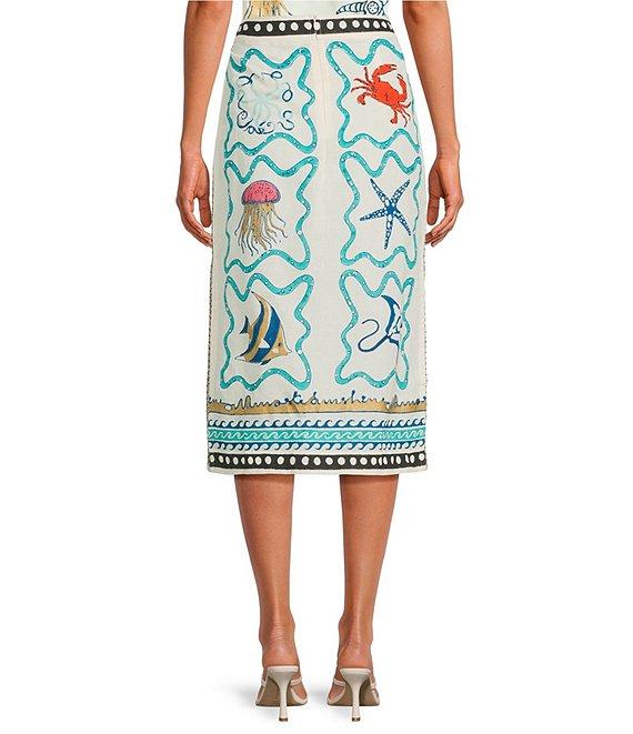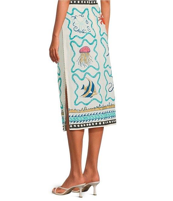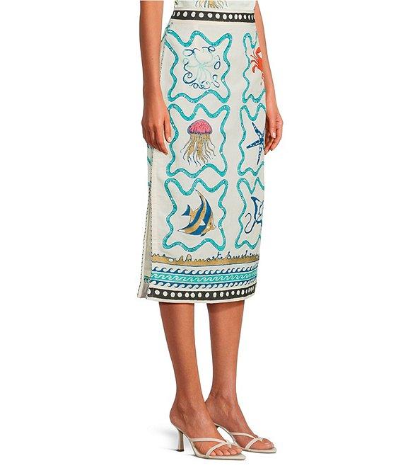 From Mo Maya, this skirt features: Cotton/linen fabrication Pencil skirt silhouette Hand printed Side slits Midi Invisible back zipper Approx. 29" length waist; 33" length for size small/medium Cotton/linen Hand wash Imported.