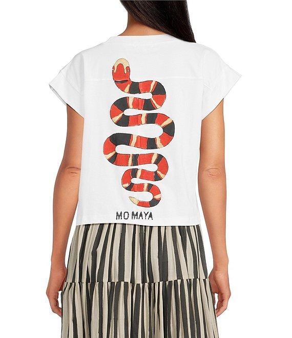 From Mo Maya, this top features: Snake design on back Round neckline Short sleeves Block printed by hand Pullover styling Approx. 23" in length Cotton Hand wash/ dry flat Imported.