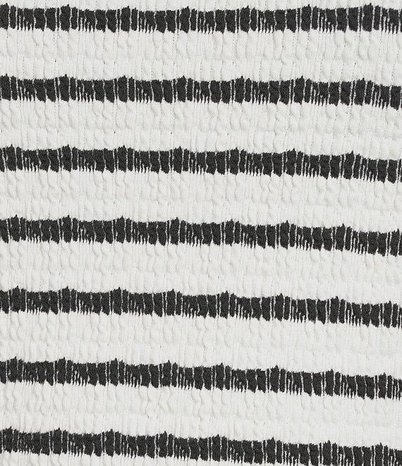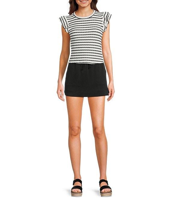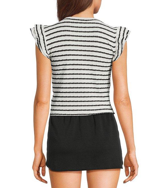 From Moa Moa, this top features: Allover stripe pattern Crew neck Short ruffle sleeves Pullover styling Polyester/rayon/spandex Machine wash cold/line dry Imported.