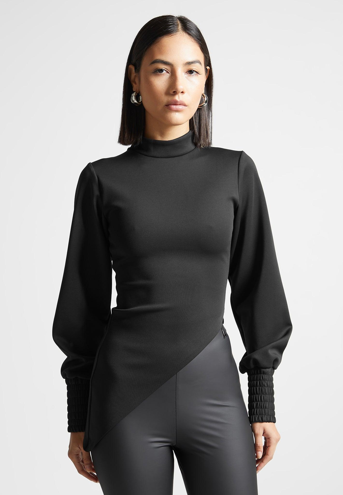 This Mock Neck Asymmetric Top is sure to make a statement. It features a high neckline for a unique look, and a modern asymmetric cut for a bold look. The combination of features provides a fashionable top perfect for any occasion. Fabric: Always check the care label for wash instructions. Model is 5'8", 32.5" Bust, 24" Waist, 32" High Hip, 37.5" Low Hip and Wears UK Size 6 Based on UK Size 6 - Front Length cm/in, Chest cm/in, Sleeve Length cm/in Stretch Factor - /3