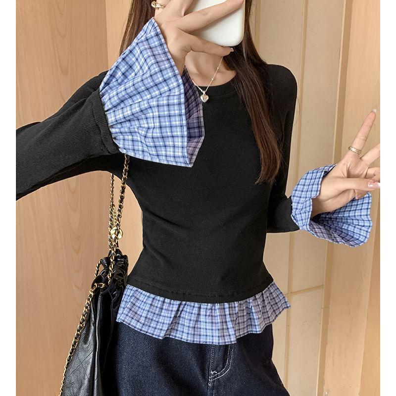 Mock Two-Piece Long-Sleeve Crew Neck Plaid Panel Knit Top