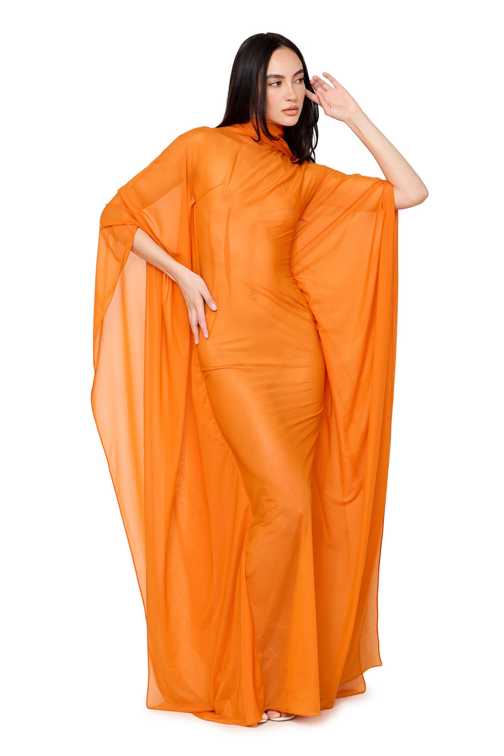 Draped mock-neck gown with dramatic billowing sleeves. The gown features double front and back darts for added contour and a long back tie neck. Self: 100% polyester. Dry clean only. Manufactured in New York, USA.