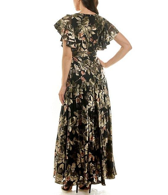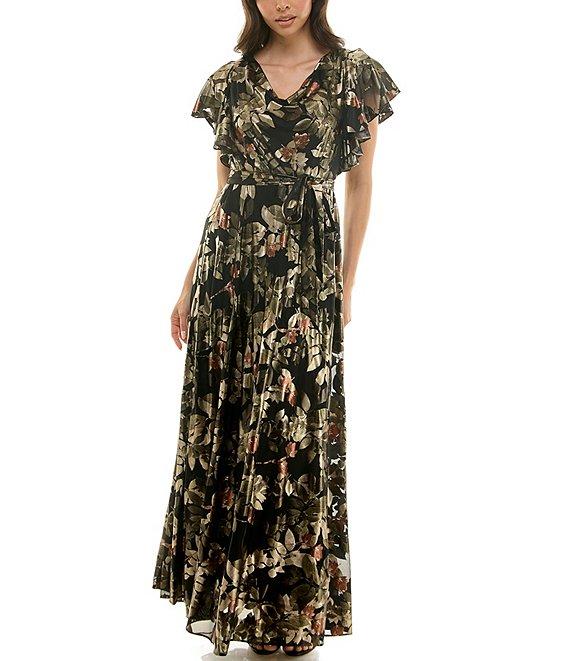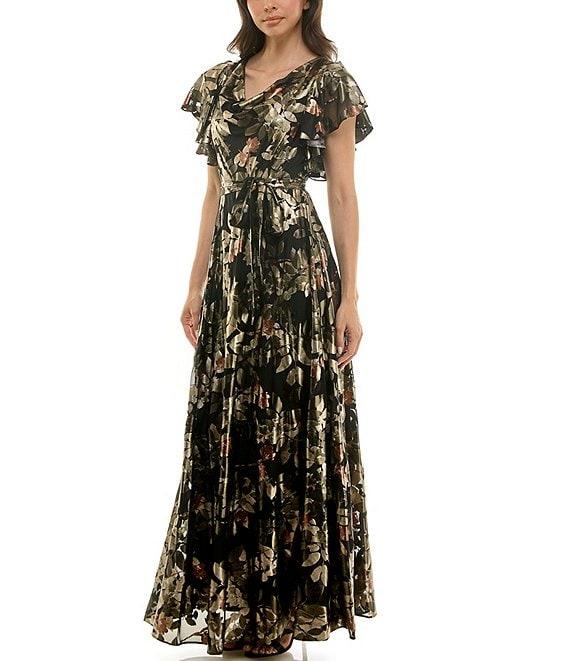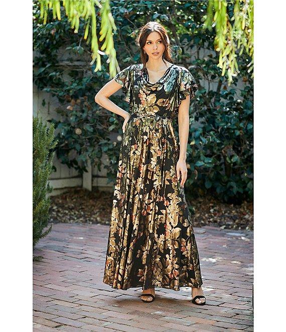 From Moda Tara, this dress features: Foil chiffon mesh fabrication Cowl neckline Short flutter sleeve Floral foil print Self belt Lined Center back zipper closure Approx. 58" in length from high point shoulder Polyester/spandex Hand wash/line dry Imported.