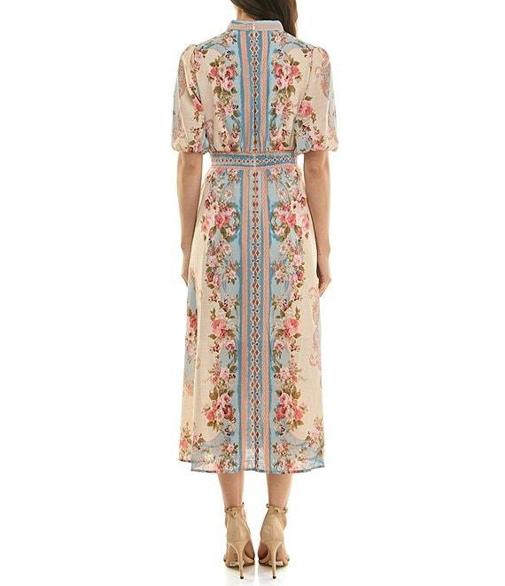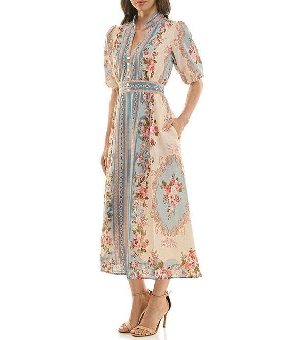 From Moda Tara, this dress features: Crosshatch poly linen fabrication Floral print Mandarin collar V neckline Elbow sleeves Center back zipper closure Side seam pockets Smocked back waist Partially lined A-line silhouette Approx. 50" length Polyester Hand wash/line dry Imported.