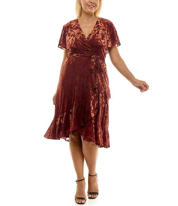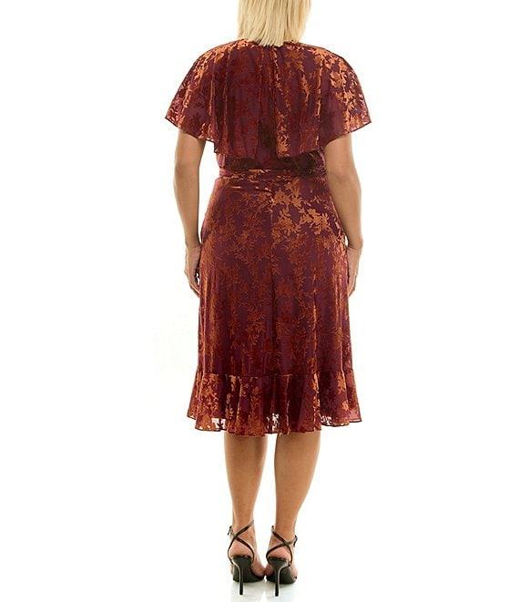 From Moda Tara Plus, this dress features: Velvet burnout fabrication Surplice v-neckline Short capelet sleeves Burnout print Faux wrap silhouette Belted Midi dress Center back zipper closure Approx. 48.5" in length Polyester/nylon/spandex Hand wash/Line dry Imported.