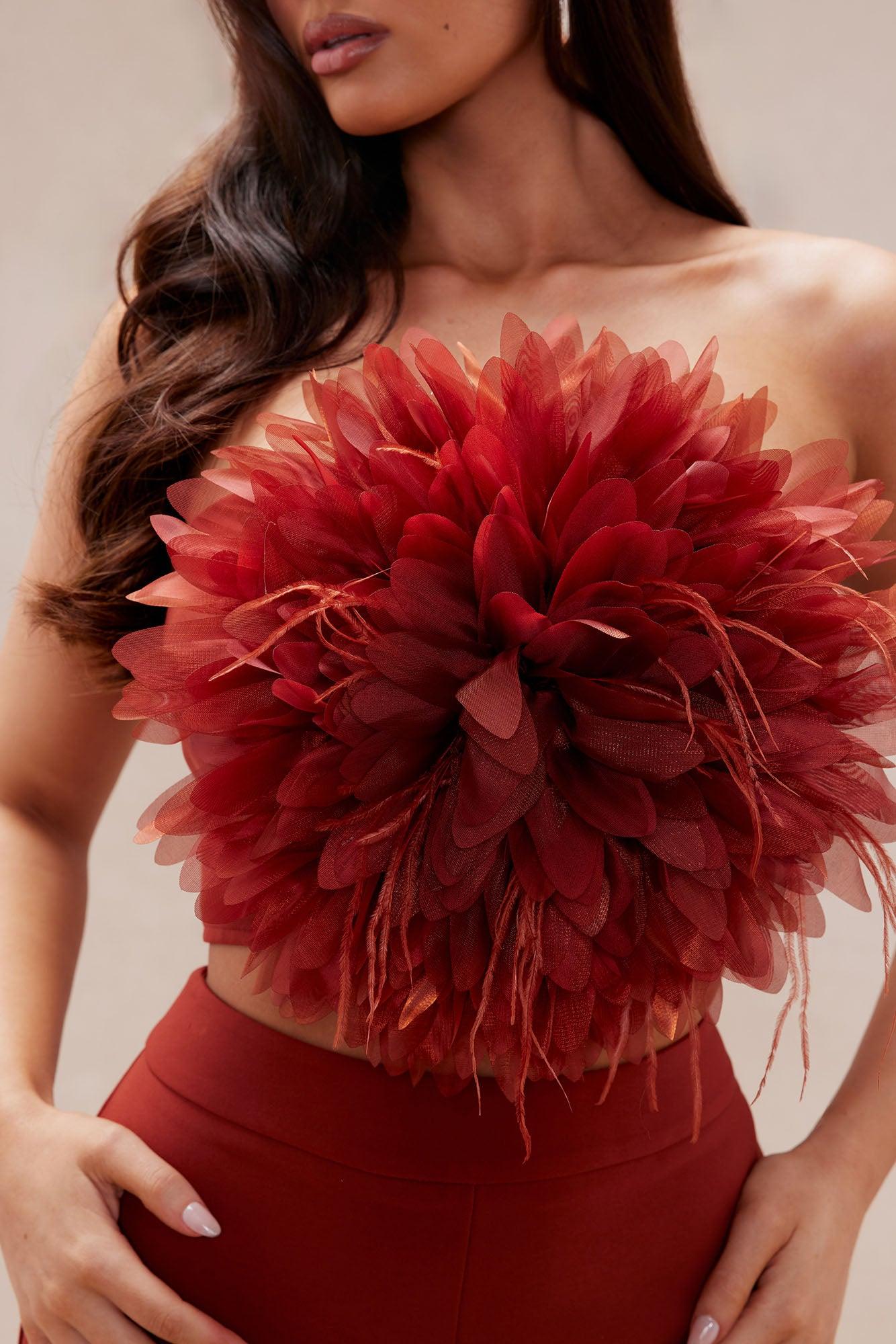 Available In Cognac. 2 Piece Pant Set 3D Floral Top Strapless Padded Back Zipper Flare Pant Stretch Shell: 95% Polyester 5% Spandex Lining: 95% Polyester 5% Spandex Pant Shell: 95% Polyester 5% Spandex Imported