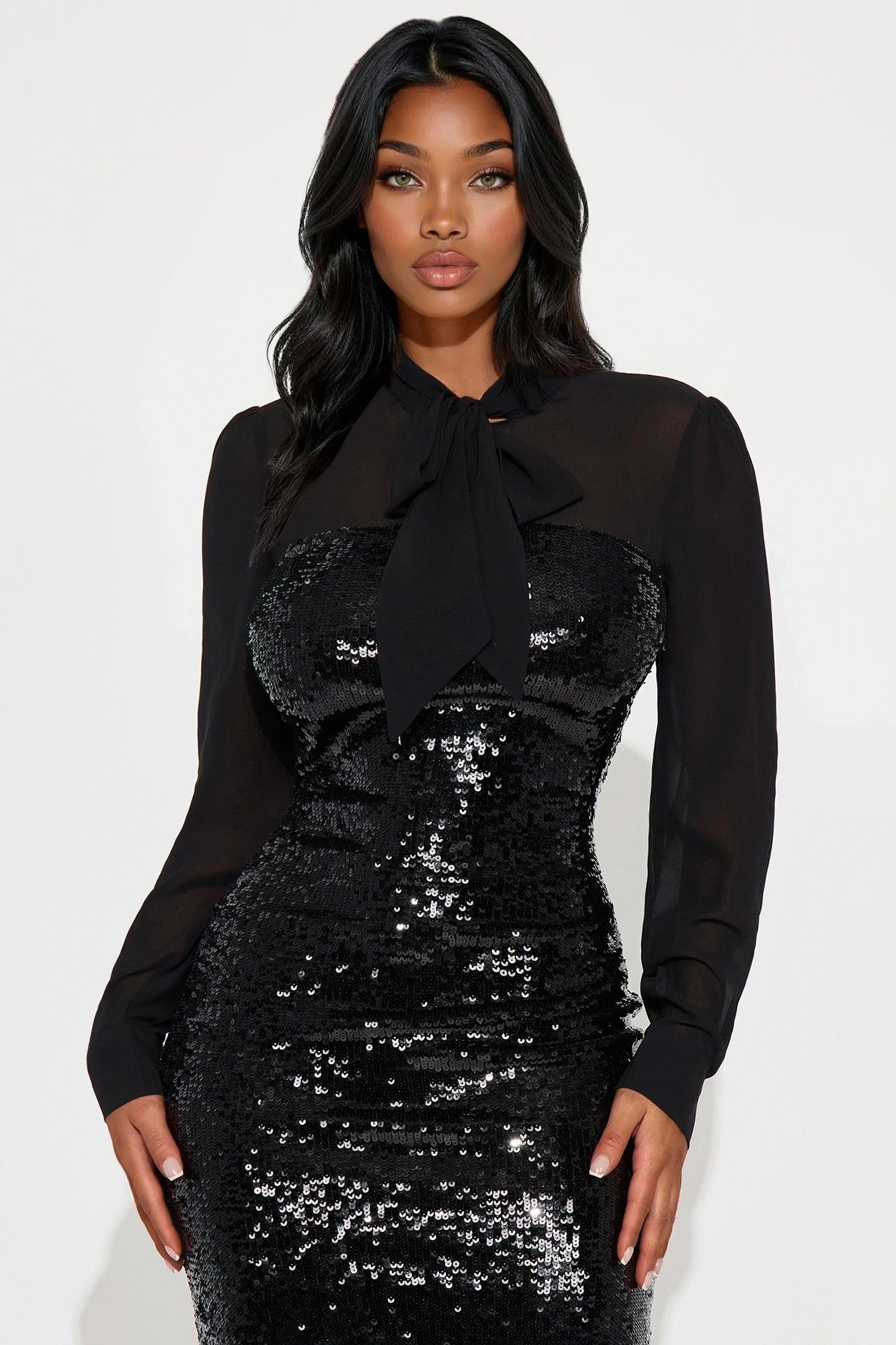 Available In Black. Sequin Midi Dress High Neck Long Mesh Sleeve Tie Front Back Keyhole Back Zipper Closure Lined Stretch Length Measured Flat = 45" Self: 100% Polyester Contrast: 100% Polyester Lining: 100% Polyester Imported