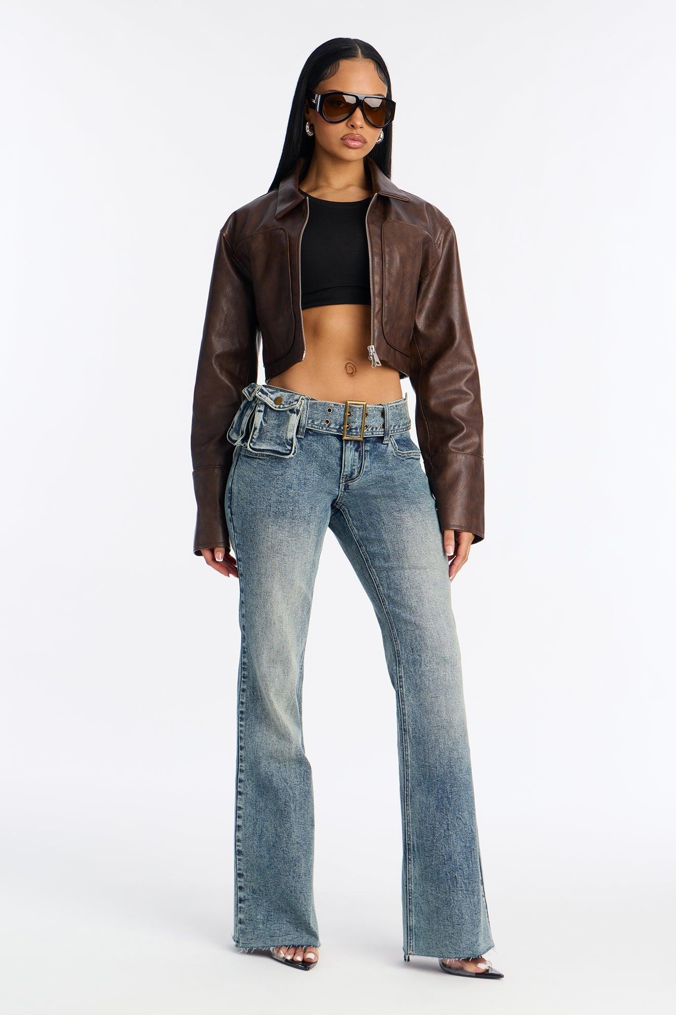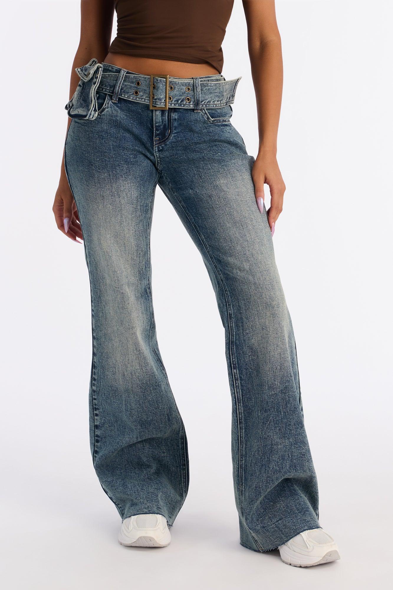 Available In Vintage Wash. Flare Jean 5 Pocket Removable Belt With Pocket Bags 8" Low Rise 34" Inseam Low Stretch Disclaimer: Due To The Specialized Distressing & Wash Process, Each Garment Is Unique. Self: 99% Cotton 1% Spandex Imported
