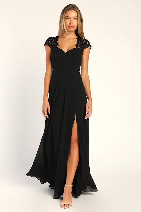 Celebrate a grand romance in the Lulus Momentous Moments Black Lace Backless Maxi Dress! Woven chiffon and stunning floral lace come together to shapes this dress with a sweetheart neckline (with no-slip strips) and sheer cap sleeves. Padded cups add extra flair to the princess-seamed bodice atop a banded waist (with a tying sash) and flowy maxi skirt with a front slit. A large cutout at the back secures with a hidden hook/clasp closure. Hidden back zipper/clasp.
