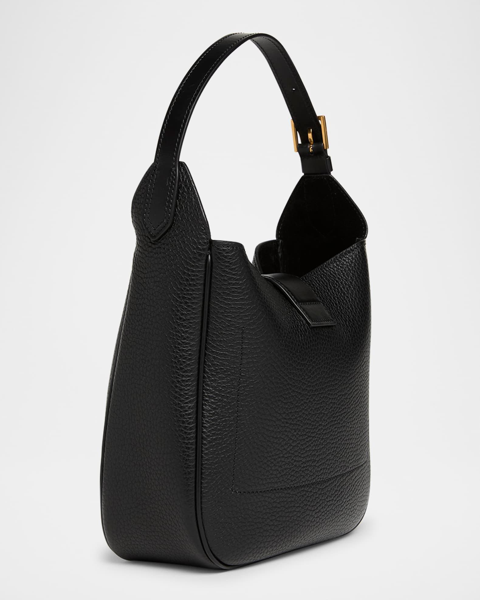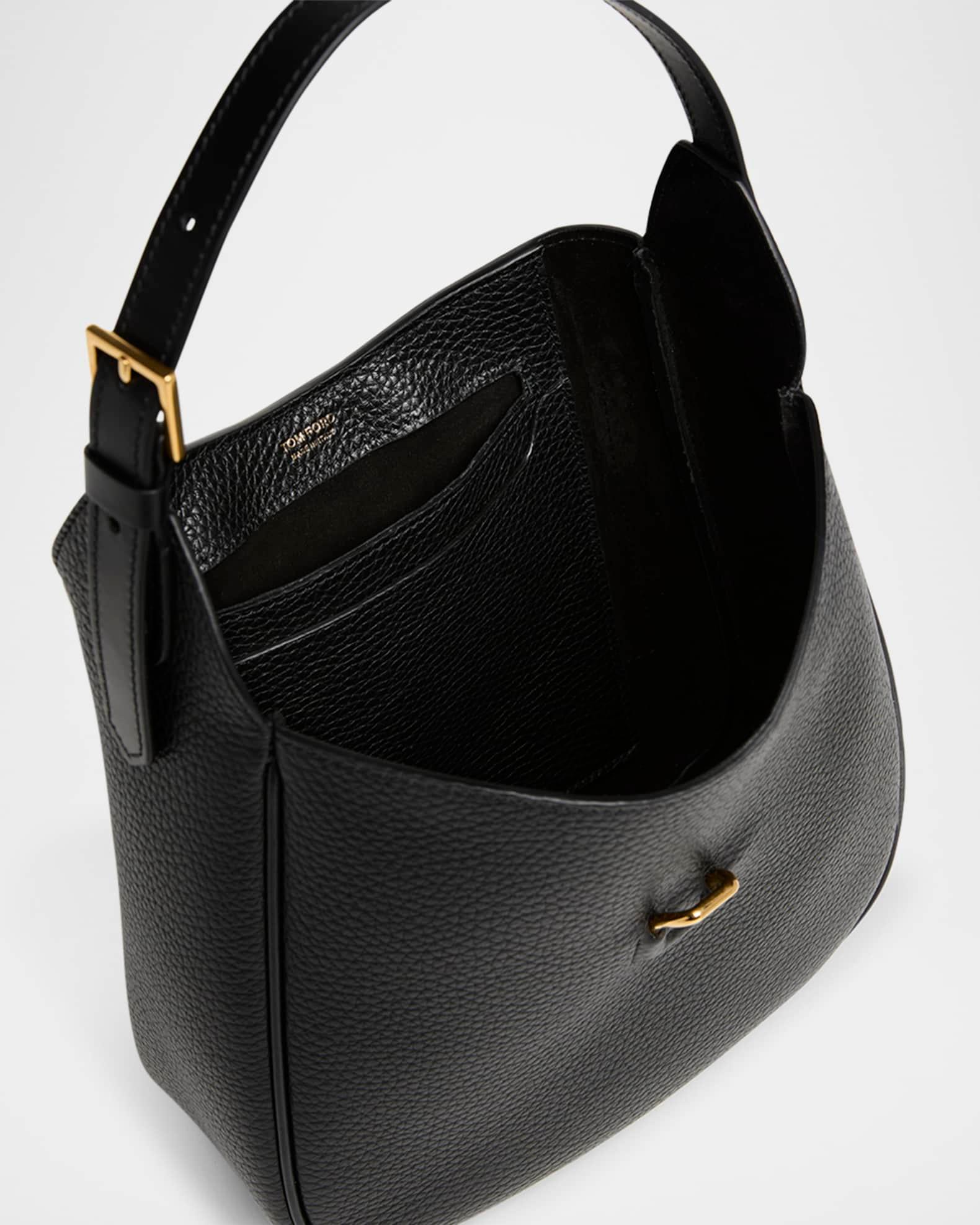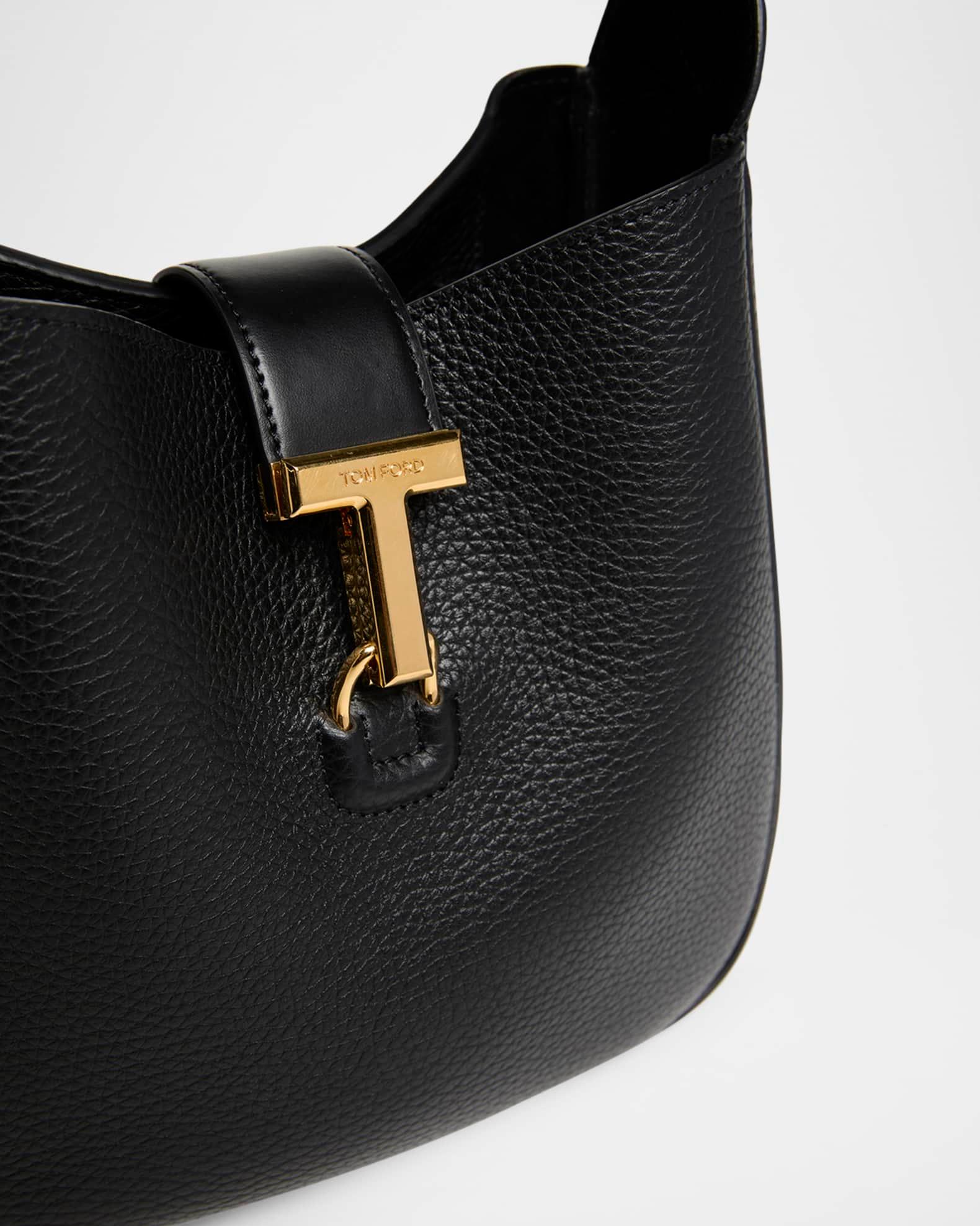 TOM FORD "Monarch" small sleek hobo bag crafted in grain leather with gold-tone hardware Adjustable shoulder strap Open top with center T clasp closure Interior, two slip pockets Lining: Leather Approx. 9.3"H x 8.9"W x 3.1"W Item Weight (Lbs.): 1.1 Made in Italy