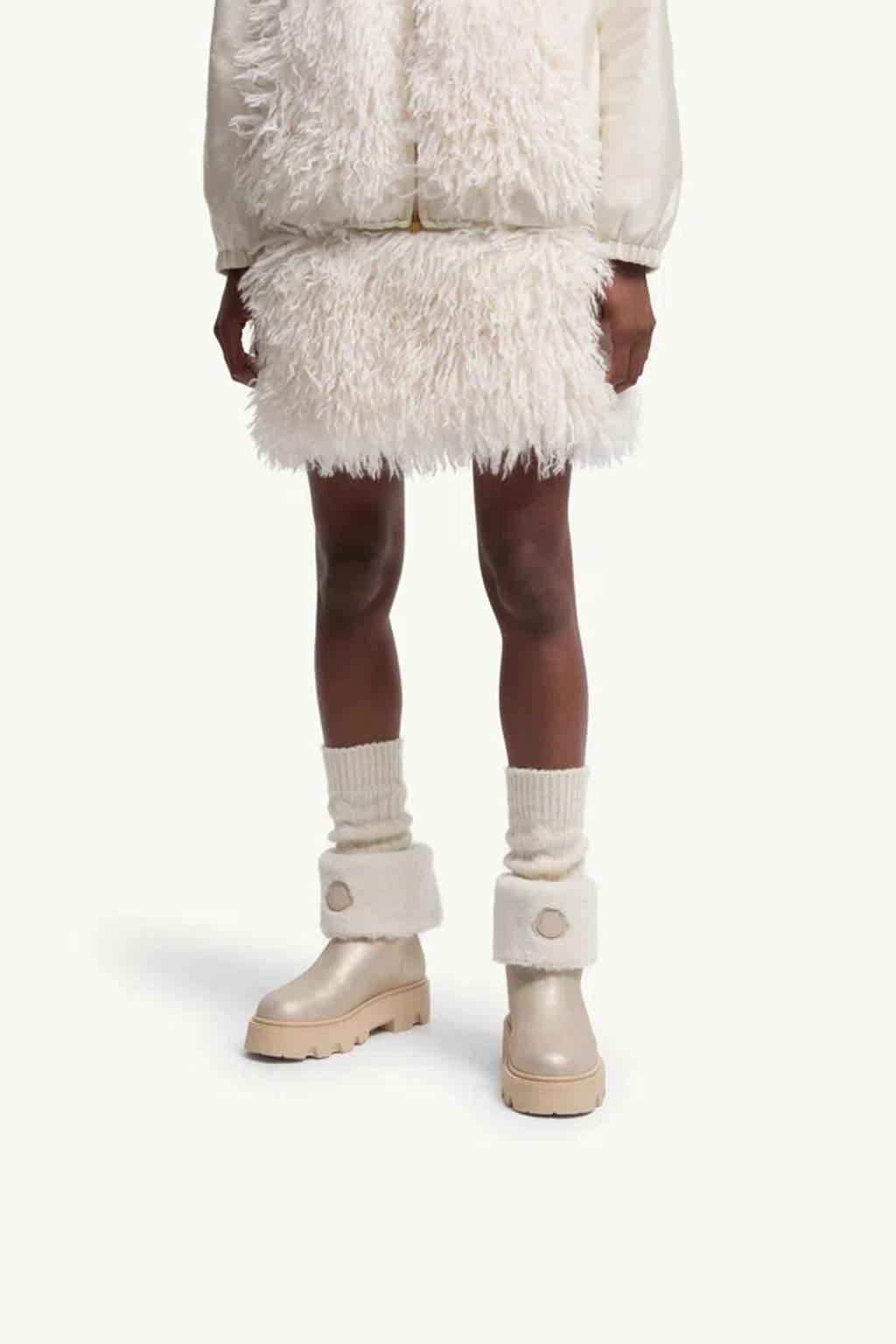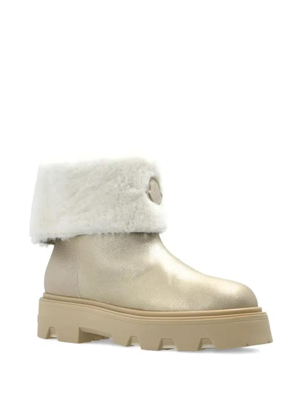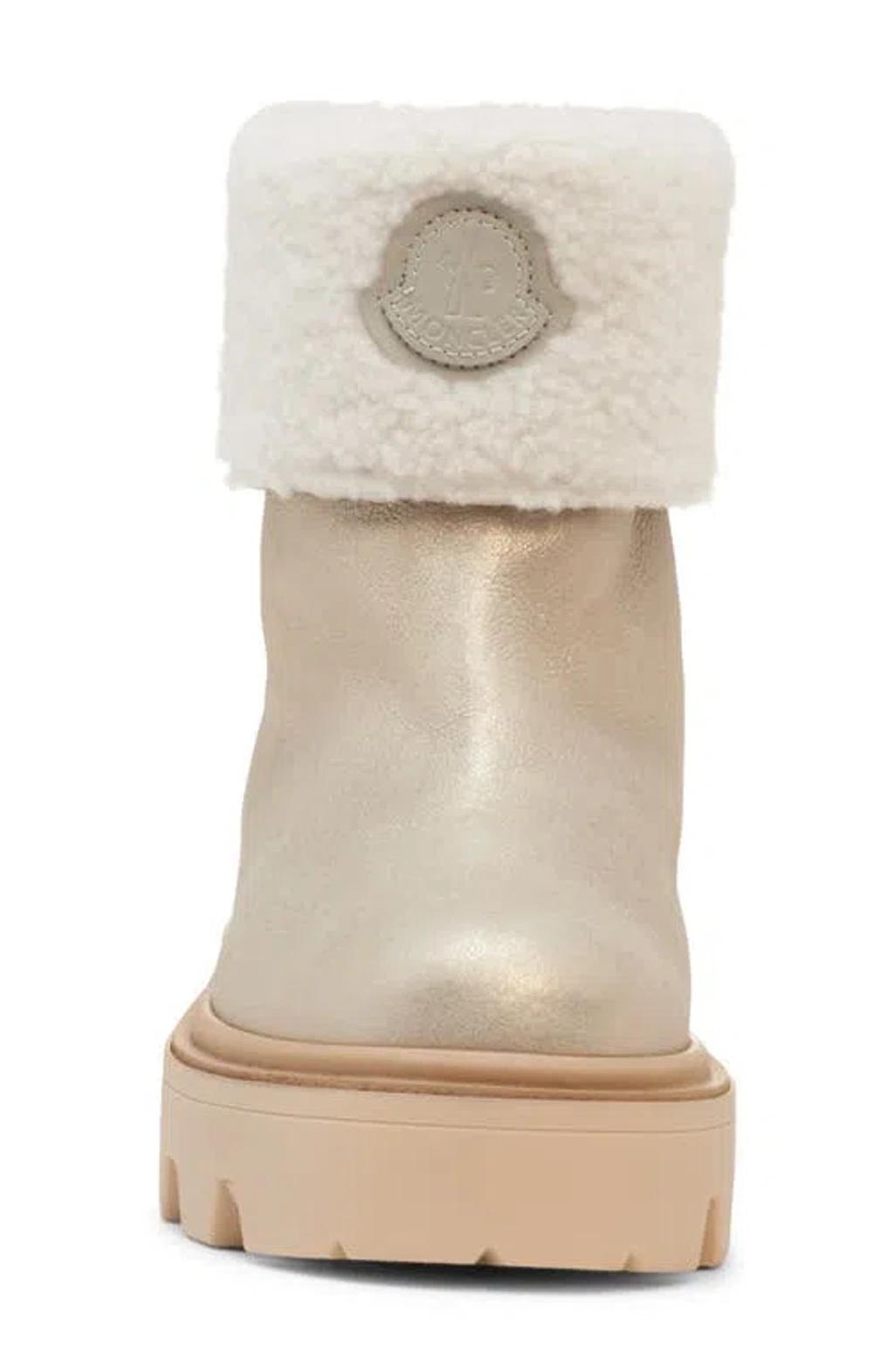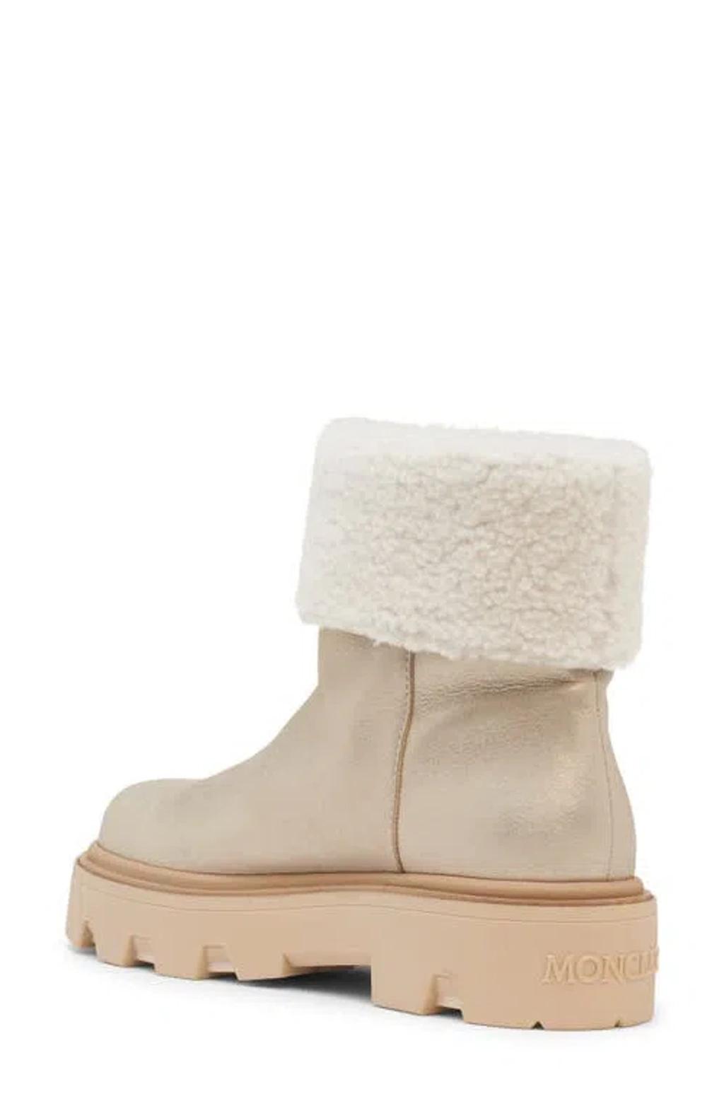Shop Moncler Aurea Shearling-trimmed Leather Ankle Boots In Multi from 800+ stores, starting at $618. Defined by sophisticated materials, the Aurea Mid are crafted from laminated shearling. Paired with a chunky rubber sole, the footwear guarantees comfort and adaptability to whatever the day may bring. * Laminated long-haired sheepskin upper * Shearling insole * TPU sole with EVA filler and leather welt * Sole height 4 cm * Calf length 13 cm composition: SOLE: 100% Elastodiene;UPPER: SHEEP; Origin: Spain; Dyed