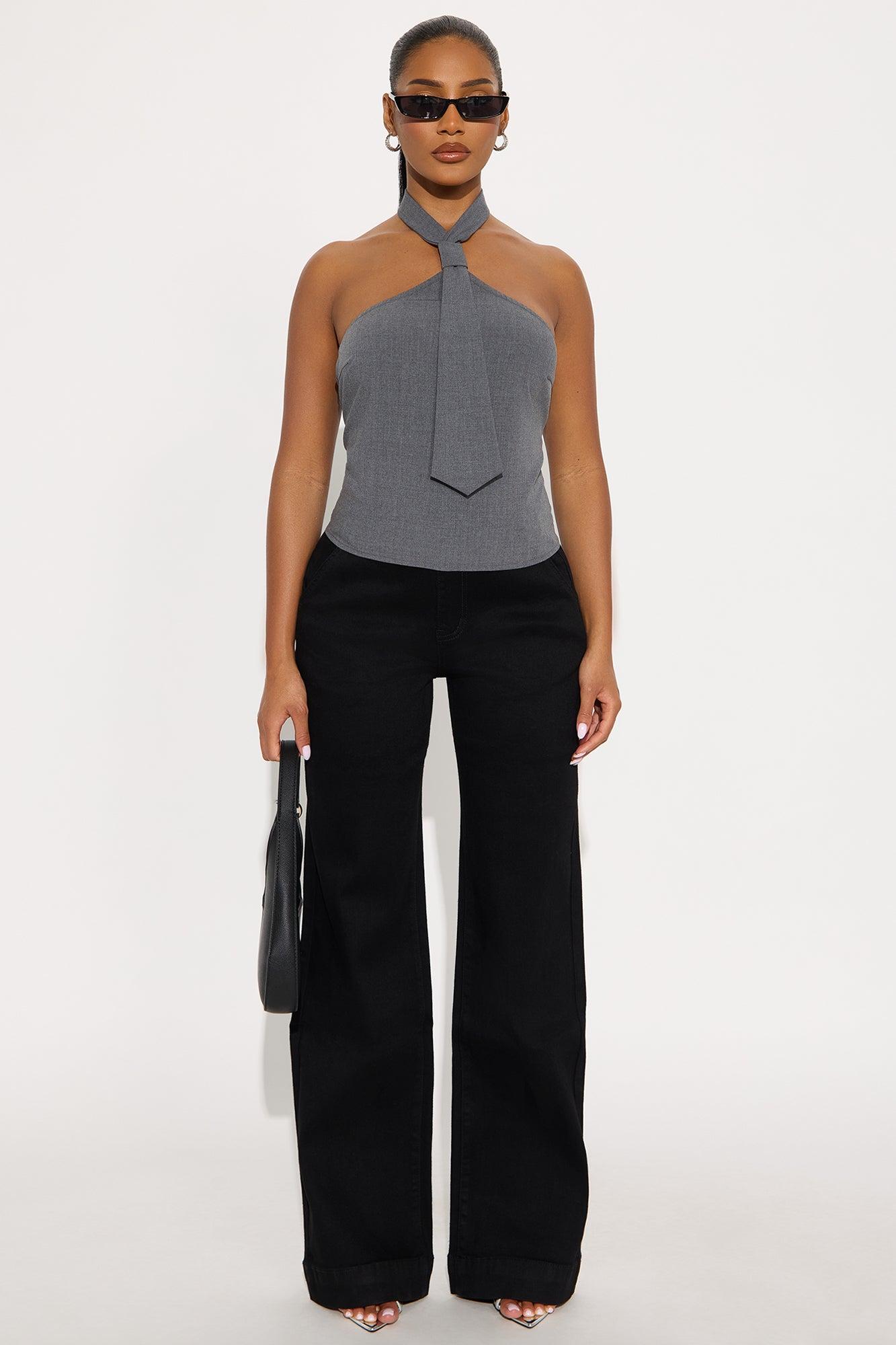 Available In Grey. Halter Top Hidden Side Zipper Neck Button Closure Neck Tie Detail Fully Lined Self: 63% Polyester 32% Rayon 5% Spandex Lining: 100% Polyester Imported California Proposition 65WARNING: Cancer and Reproductive Harm - www.P65Warnings.ca.gov.