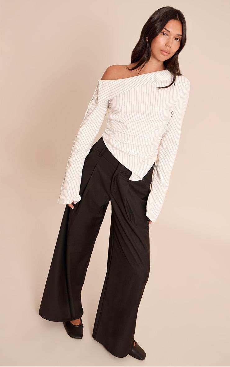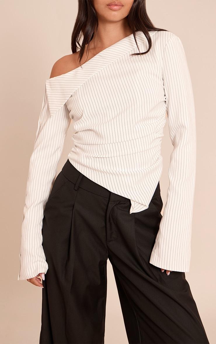 Make a bold statement in the monochrome pinstripe bardot asymmetric hem long sleeve shirt. Designed in lightweight woven fabric with striking monochrome pinstripes, this shirt features a bardot neckline and asymmetric hem for a modern tailored twist. Style with high-waisted pants for an elevated finish.Length approx 48.5cm/19inch (Based on sample size US 4)Model wears size UK 8/ EU 36/ AUS 8/ US 4Model Height - 5ft 9inchp]:!mb-4inch>Brand: PrettyLittleThingCategory: TopsProduct type: ShirtColor: MonochromeMaterial: Woven CrepeOccasion: Day