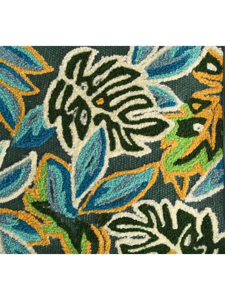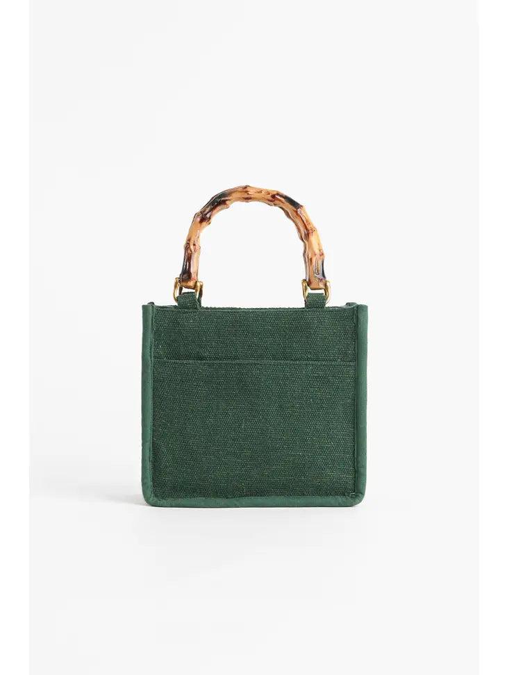 Mini tote, Bamboo hand-held straps, hand embellished front in a tropical pattern, long detachable crossbody strap with lace detailing, magnetic button closure, made in hand-woven jacquard, fully lined interiors with zip pocket and a mobile pocket.