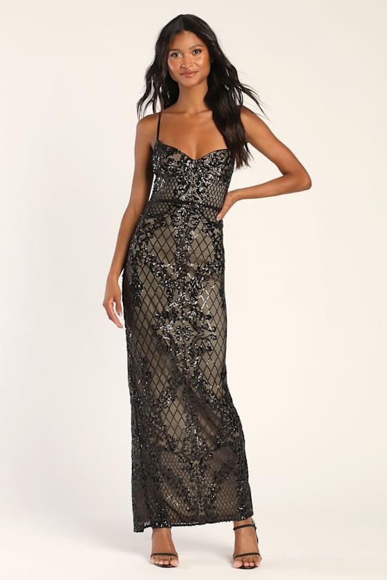 The Lulus Moonlit Love Black Sequin Sleeveless Maxi Dress was made for the most romantic memories! A shiny black sequin pattern adorns a mesh construction (atop a beige knit lining) and shapes adjustable spaghetti straps, a romantic sweetheart neckline, and a fitted bodice with bustier-inspired cups. A high waist carries into a figure-skimming skirt that ends at a maxi hem. A sultry kick pleat-style slit in the back adds an edge to this alluring dress. Hidden back zipper/clasp.