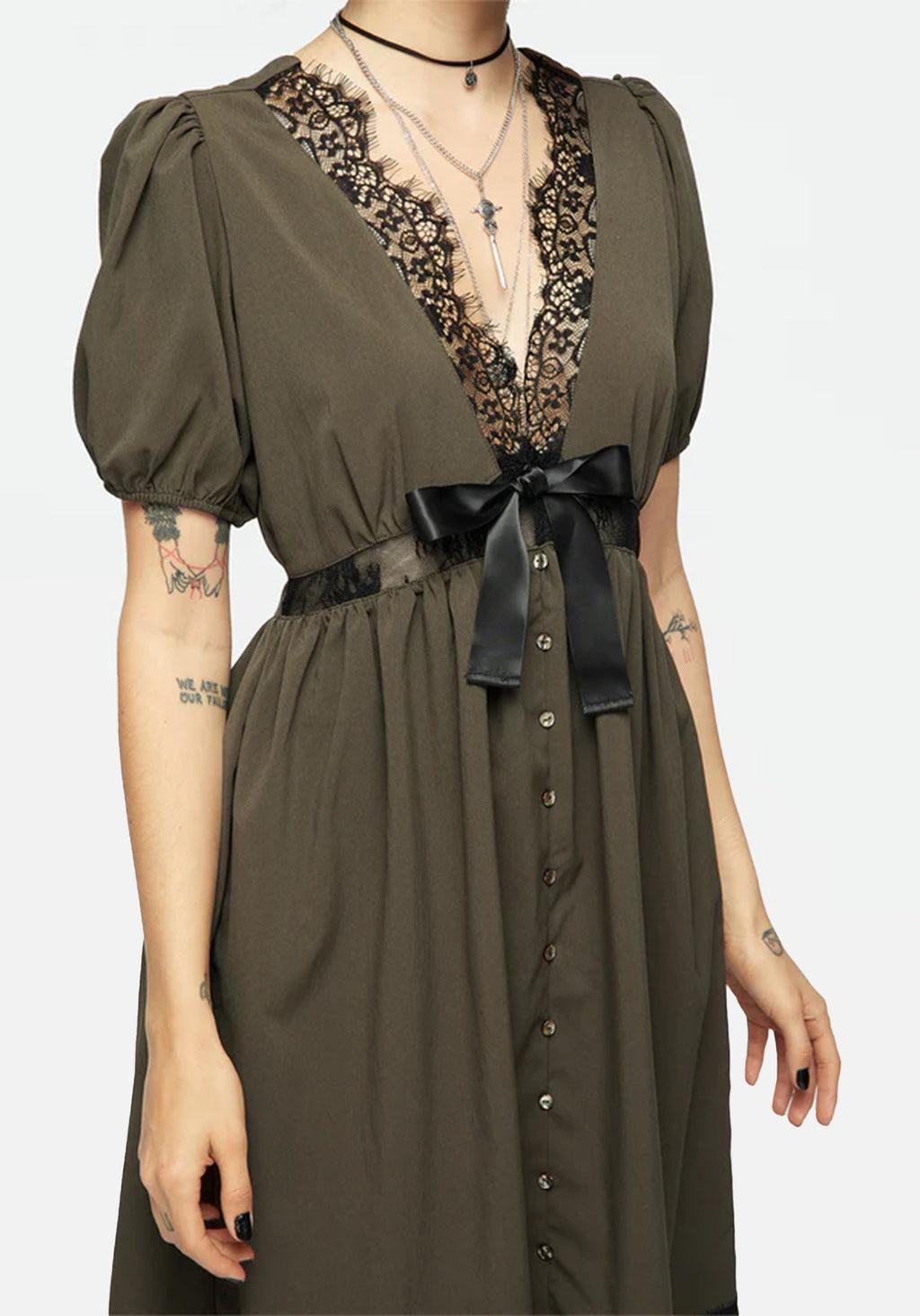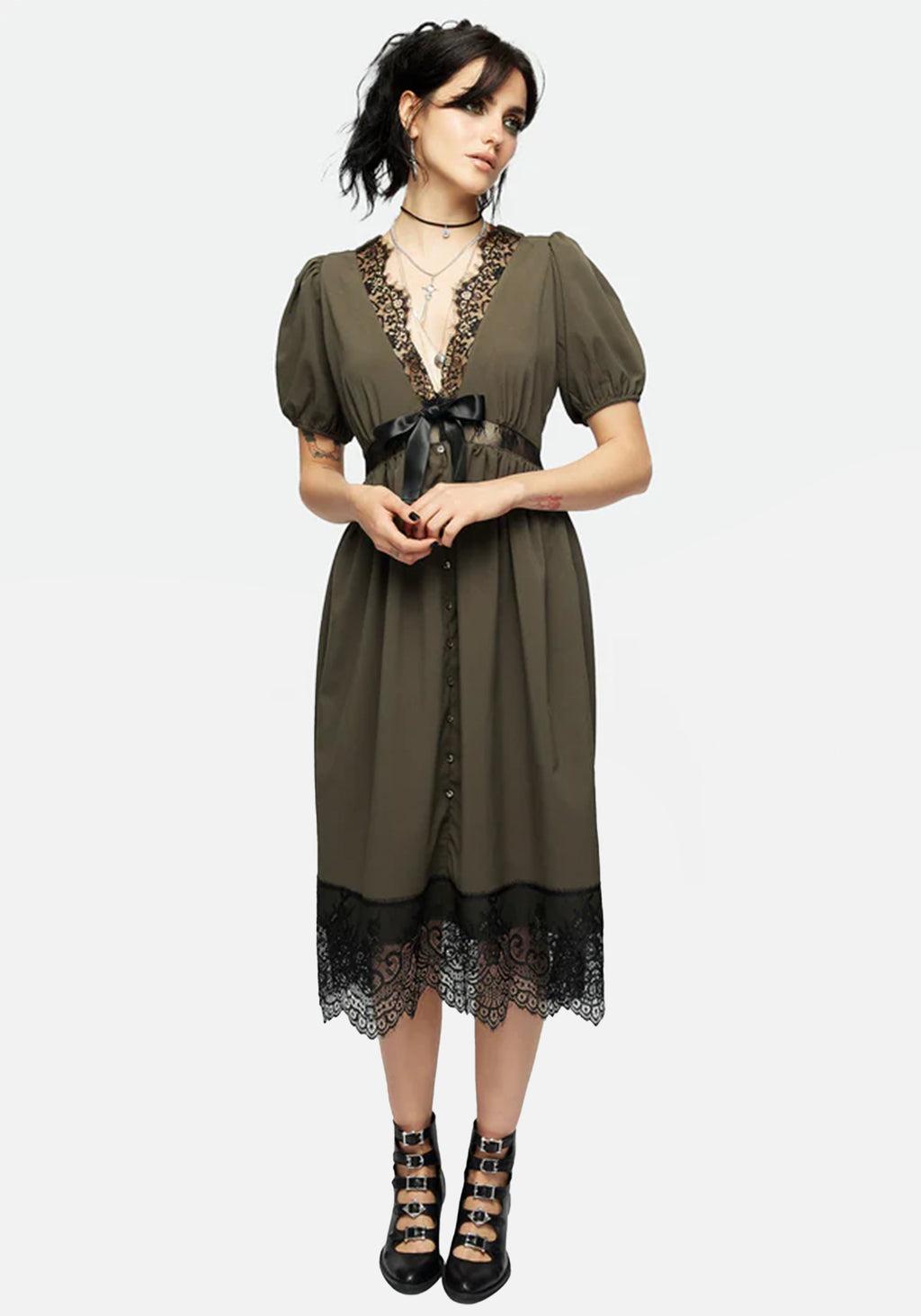 Mark the grave - Green midi dress with sheer lace panelling - Classically flattering fit ‘n’ flare shape - Short puff sleeves with elasticated hems for added volume - Lace-trimmed deep V-neck & hems - Sheer lace waist panel follows the line of the underbust to emphasise your shape - Satin bow between neckline and non-functional pearlescent centre-front skirt buttons - Concealed side-zipper for easy dressing - Deep olive green slight-stretch crepe-like fabrication contrasts from soft (not scratchy!) black lace detail - Wear over bodysuits, mesh tops, or bralets for more coverage (may we rec: the Eternal Lace Crop Top) - To die for! Main: 97% polyester, 3% elastane Contrast: 90% nylon, 10% elastane Brianne is 5'7" and wearing a UK8 / US4