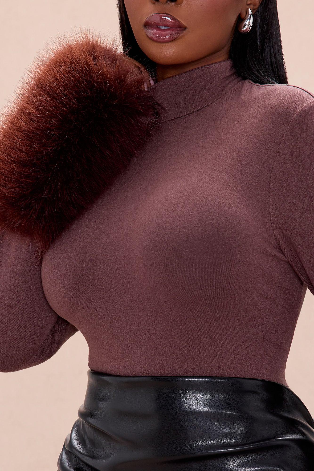 Available In Chocolate And Cream. Bodysuit Mock Neck Long Sleeve w/ Faux Fur Hidden Back Zipper Snap Button Closure Stretch Shell: 93% Polyester 7% Spandex Fur: 100% Polyester Imported California Proposition 65WARNING: Cancer and Reproductive Harm - www.P65Warnings.ca.gov.