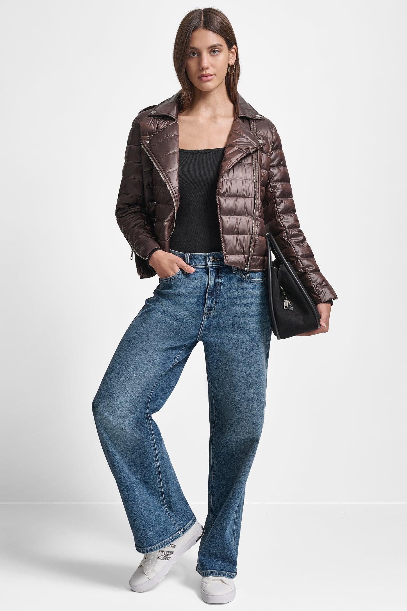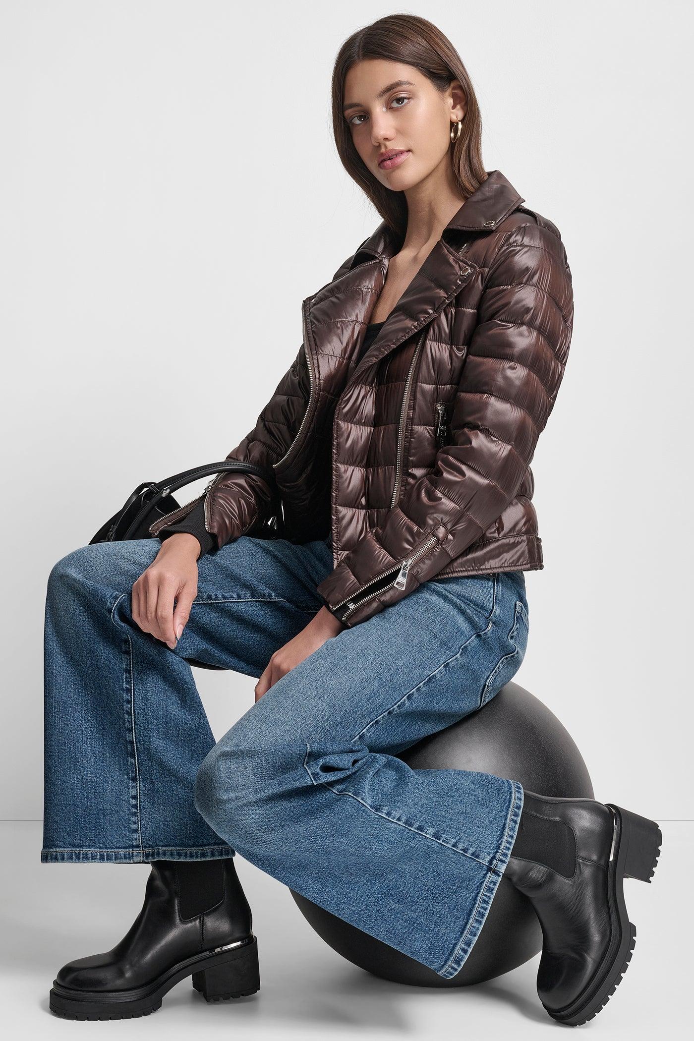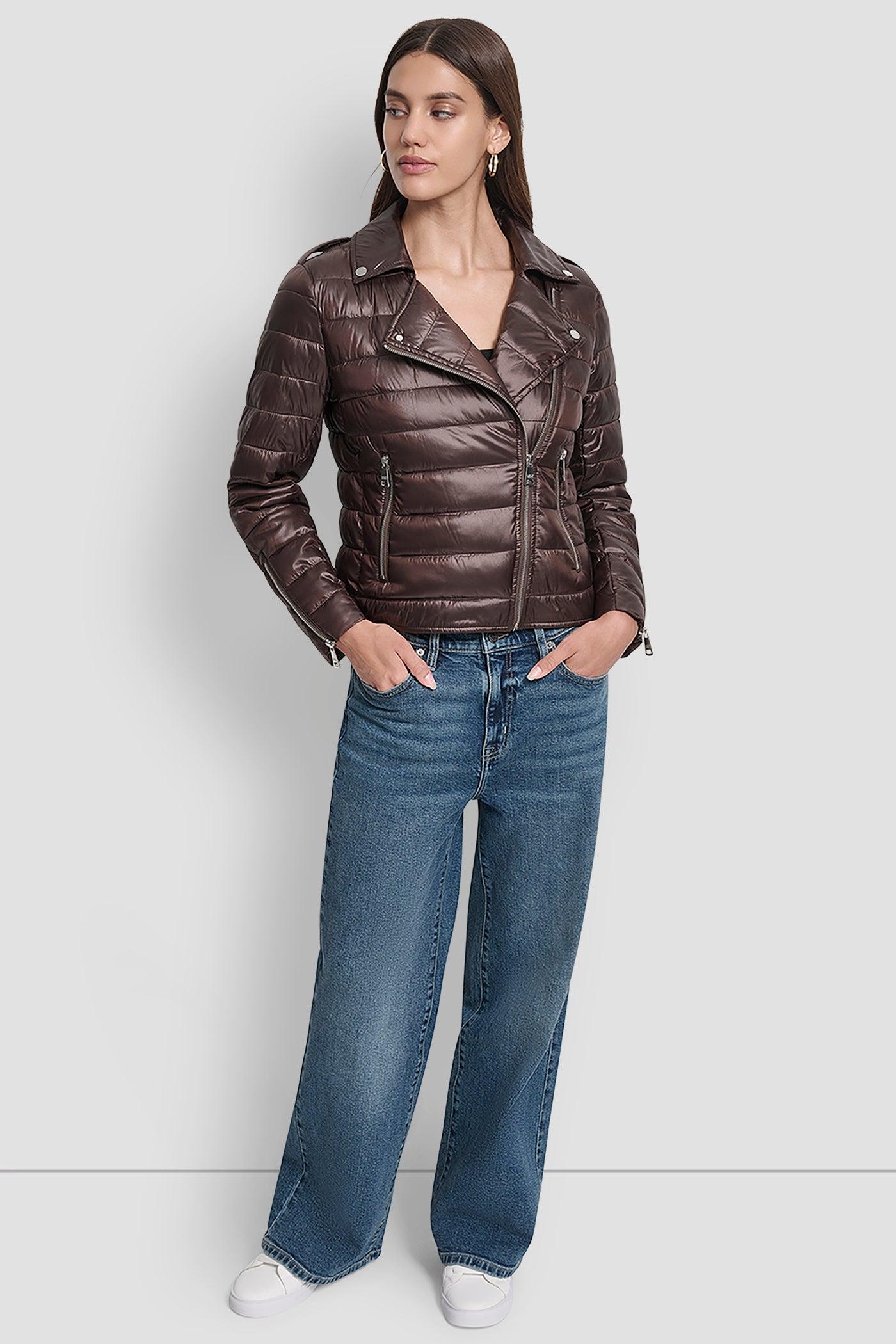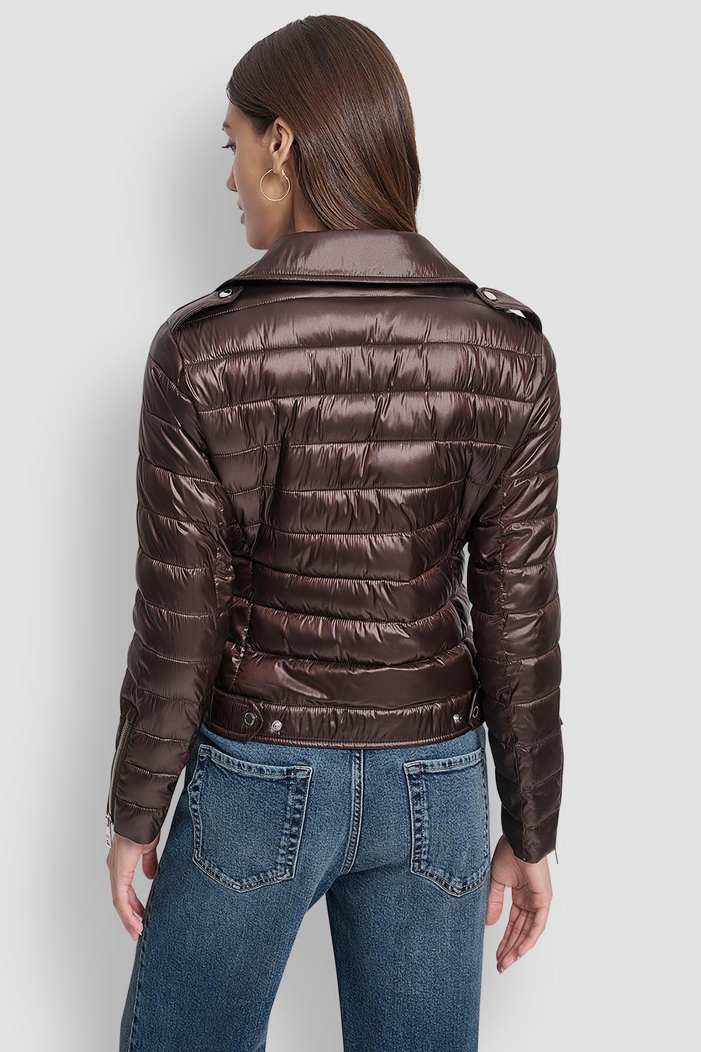 Spread Collar Moto-Style Puffer JacketAsymmetric zip fasteningVertical zip pockets at hip, lin...