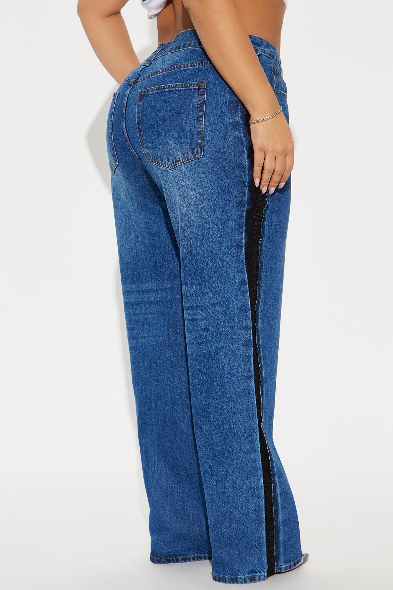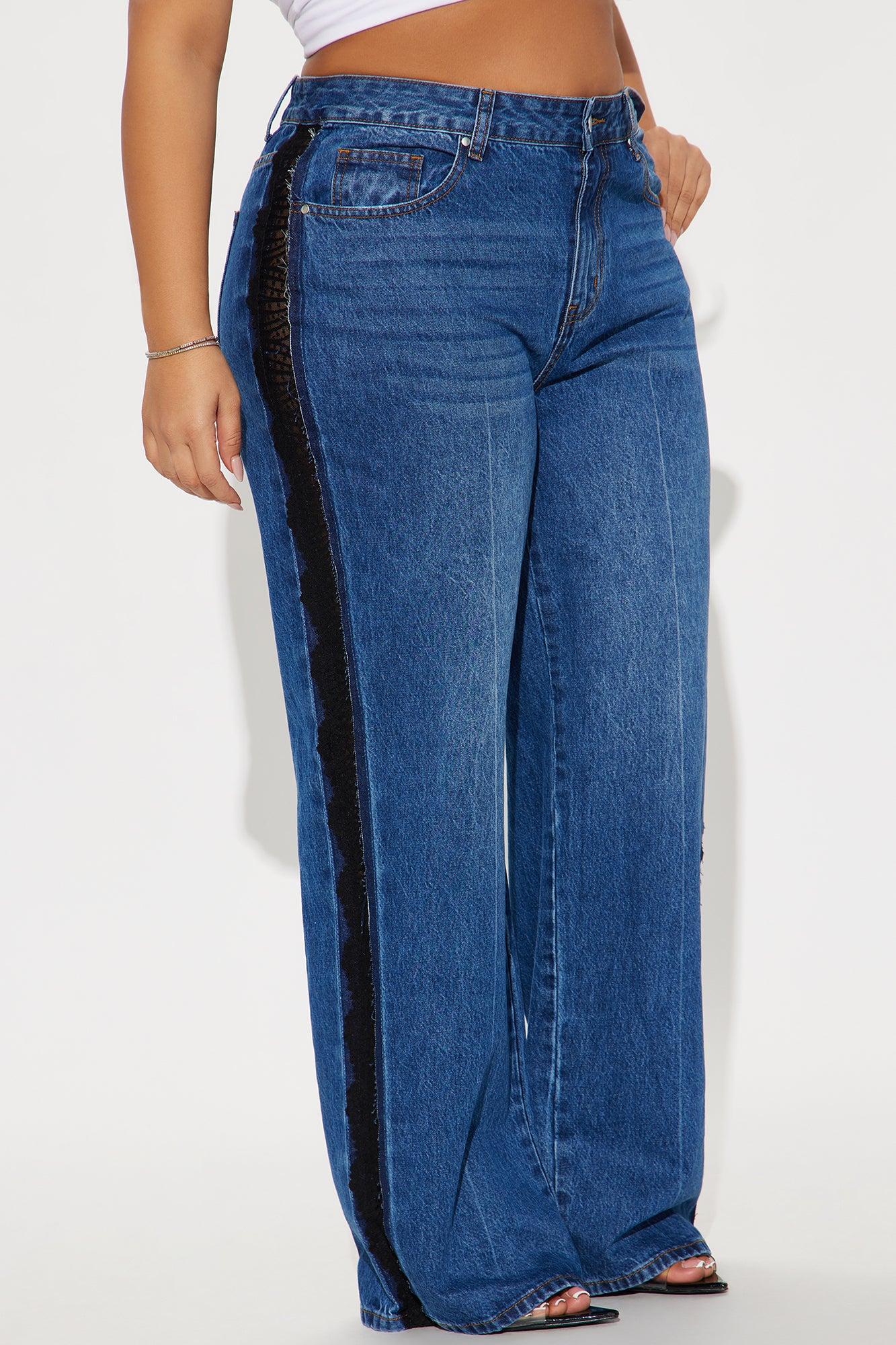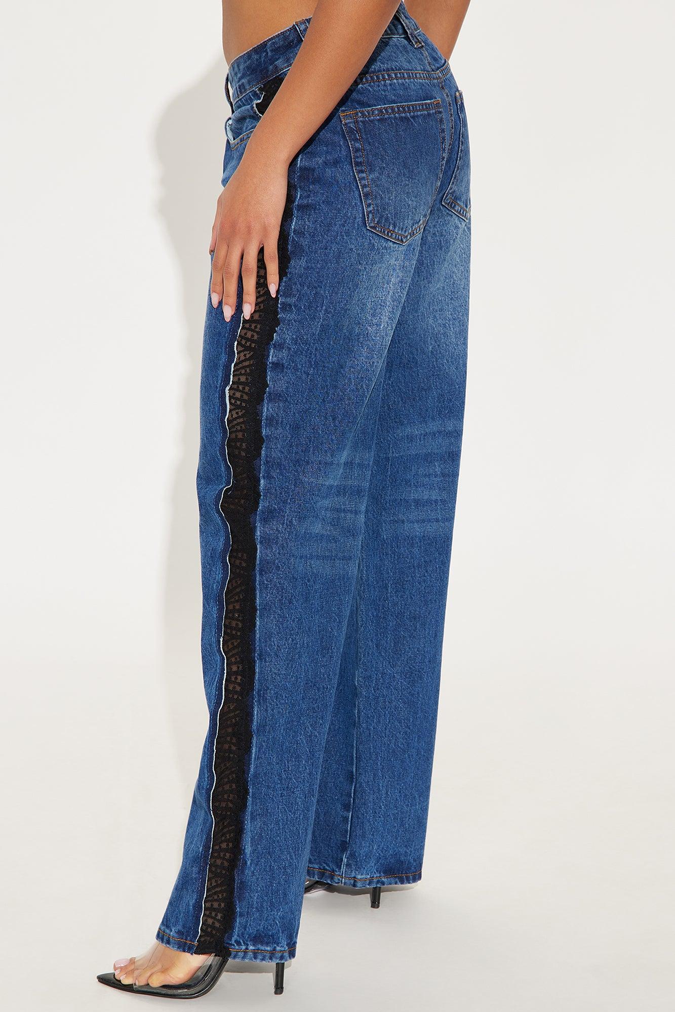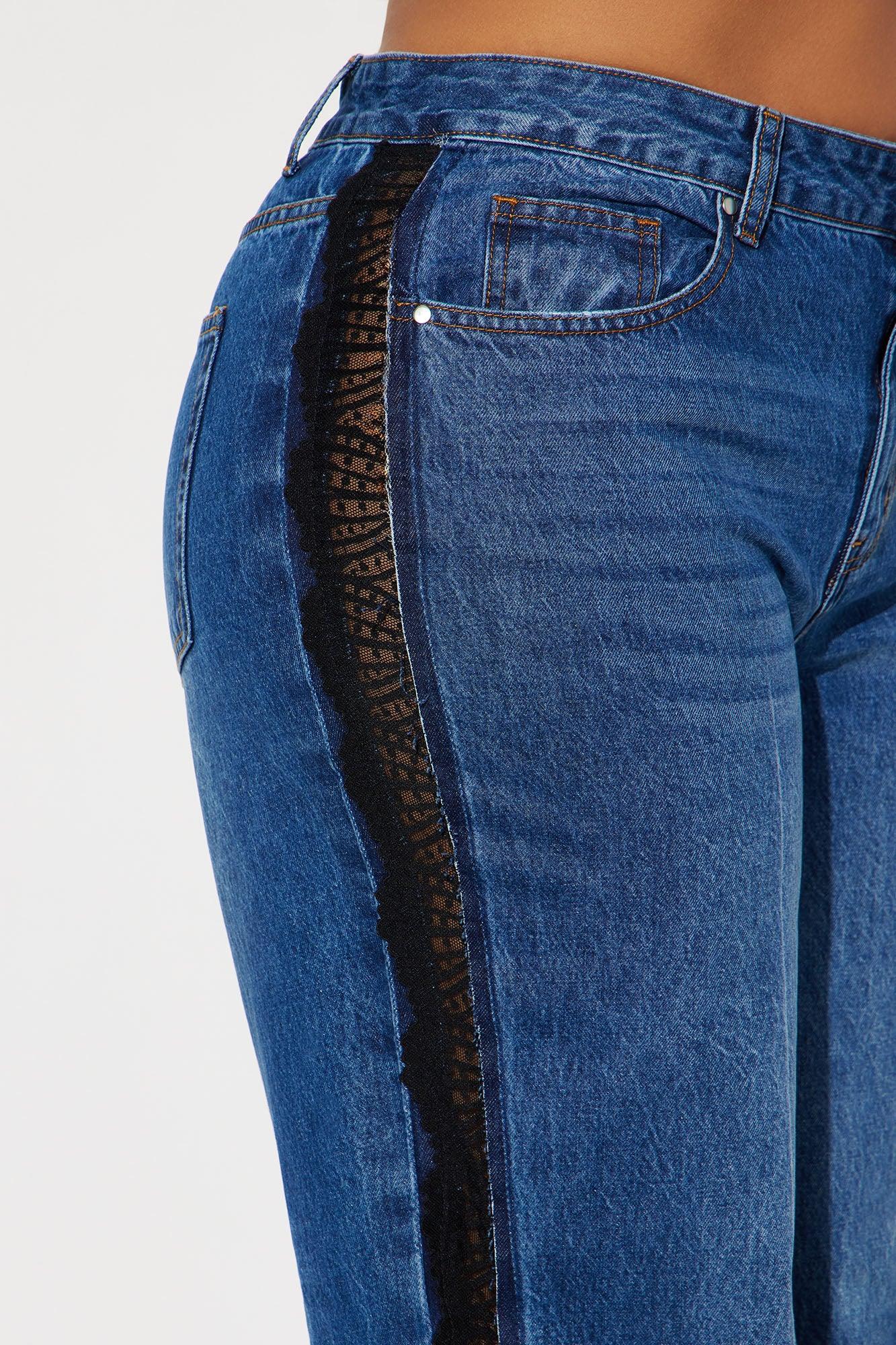 Available In Dark Wash. Straight Leg Jean Lace Insert Detail 5 Pocket 10.5" High Rise 32" Inseam Non Stretch Disclaimer: Due To The Specialized Wash, Each Garment Is Unique. 100% Cotton Imported