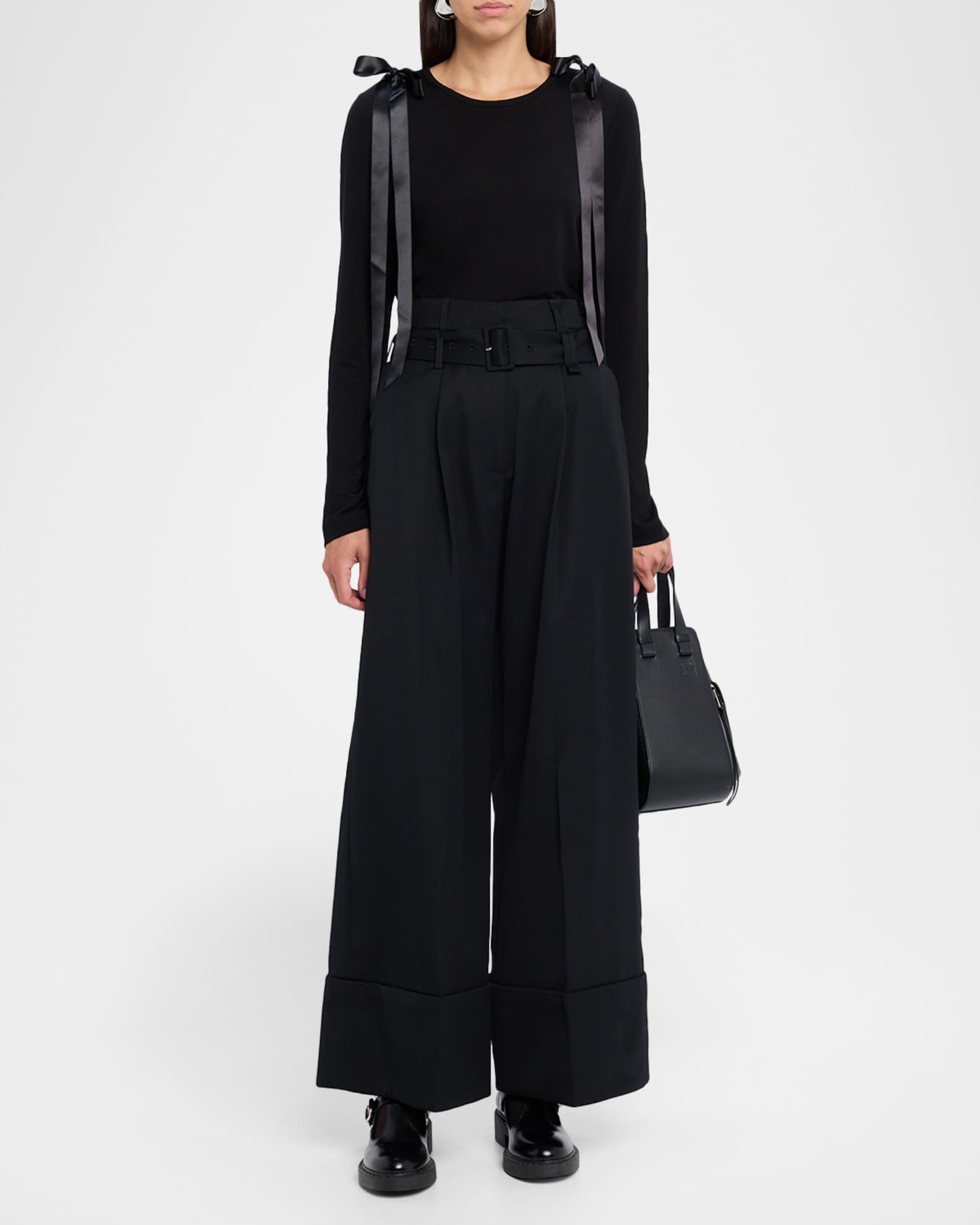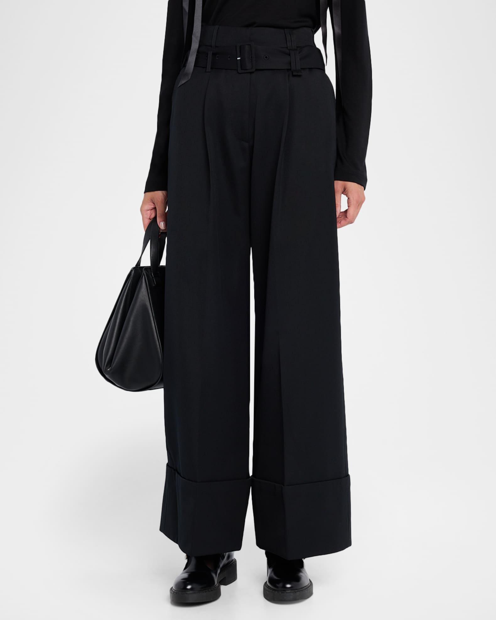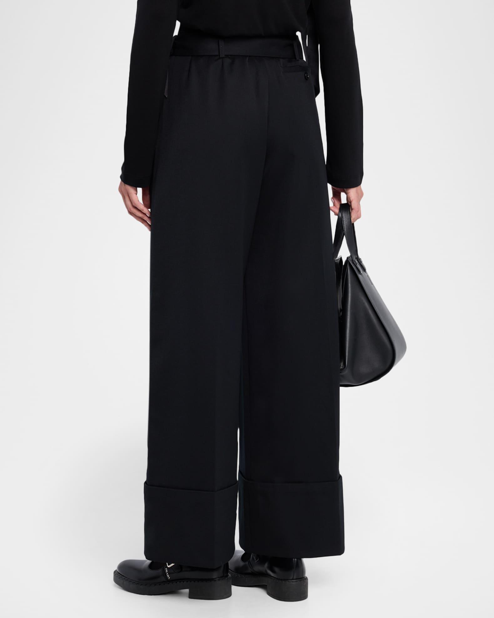 Tailored with pressed creases along the leg, these trousers by Simone Rocha feature an exaggerated cuffed hem High rise Adjustable belt Slanted side pockets Single back welt pocket Full length Wide legs Hidden hook/zip fly; double belt loops Virgin wool/acetate Made in Portugal Proposition 65 warning for California residents