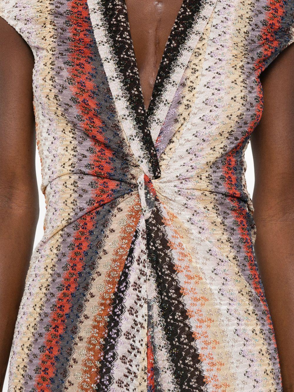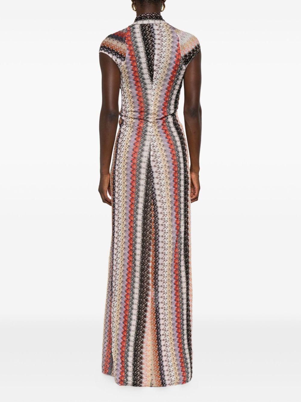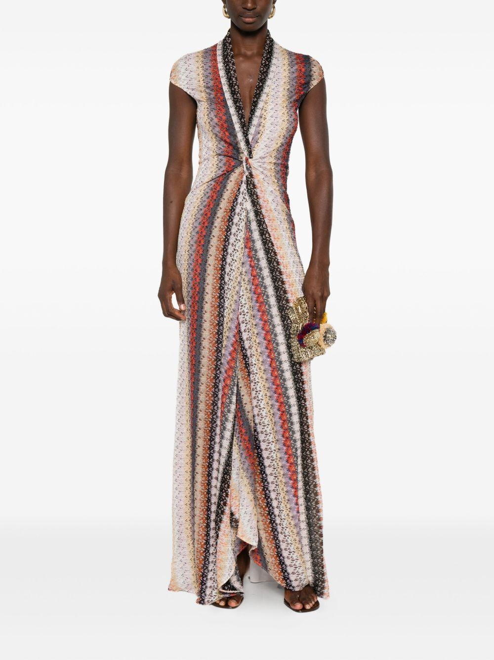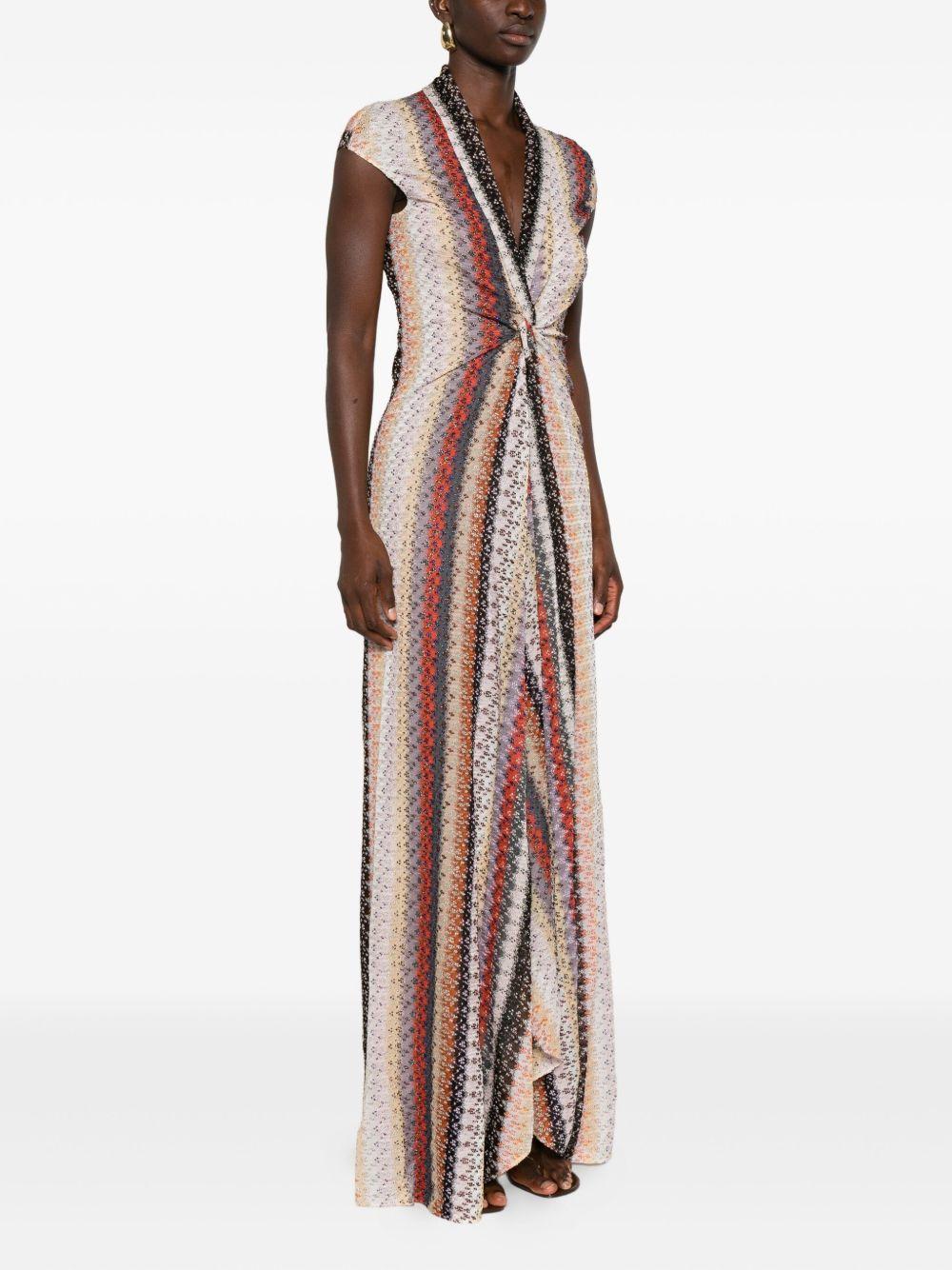 Missoni multicolored striped-knit maxi dress | Pink | multicolored | striped pattern | knit fabric | V-neck | short sleeves | front knot detail | interior slip-dress | The item you receive may differ slightly from the item photographed. This is due to the artisanal nature with which all Missoni products are constructed. | Viscose/Metallised Fibres/Polyamide/Elastane | Day Dresses | Dresses | Clothing | Women