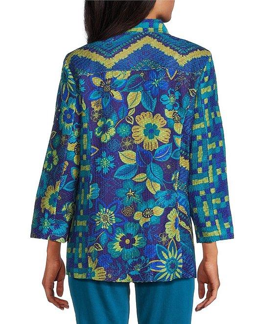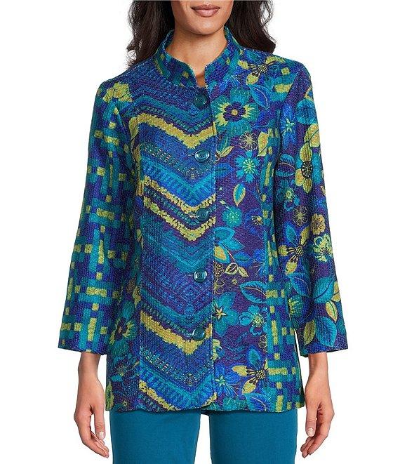 From Multiples, this jacket features: Novelty textured knit fabrication Stand collar 3/4 sleeves Fitted Multi print Front inseam pockets Straight hemline Button-front closure Approx. 29" length Polyester Turn garment inside out-machine wash cold Imported.