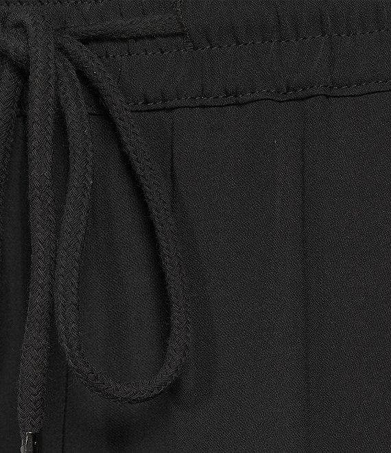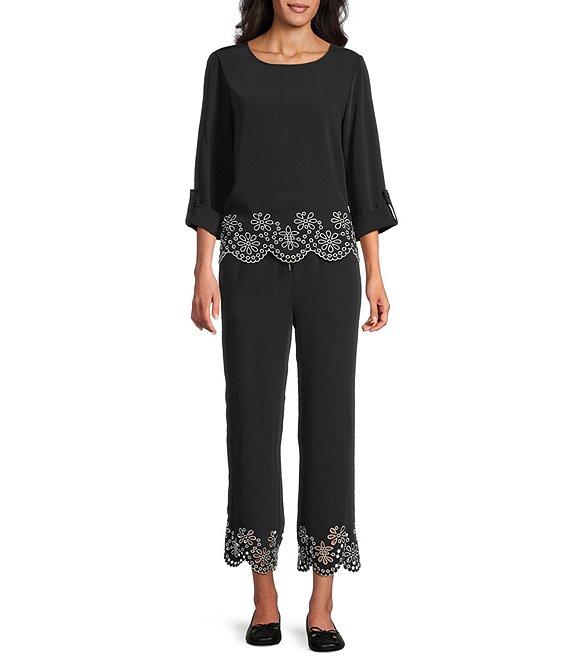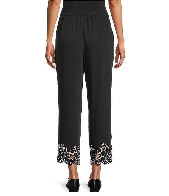 From Multiples Petite, these pants feature: Solid woven fabrication Wide-leg silhouette Elasticized waist with drawstring Side pockets Regular fit Embroidery motif at hem Scalloped hem Pull-on construction Approx. 24" length; 19.5" leg opening; 12" front rise; 16.25" back rise Polyester Place in garment bag; machine wash cold Imported.