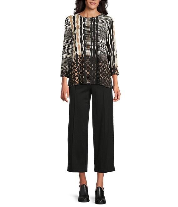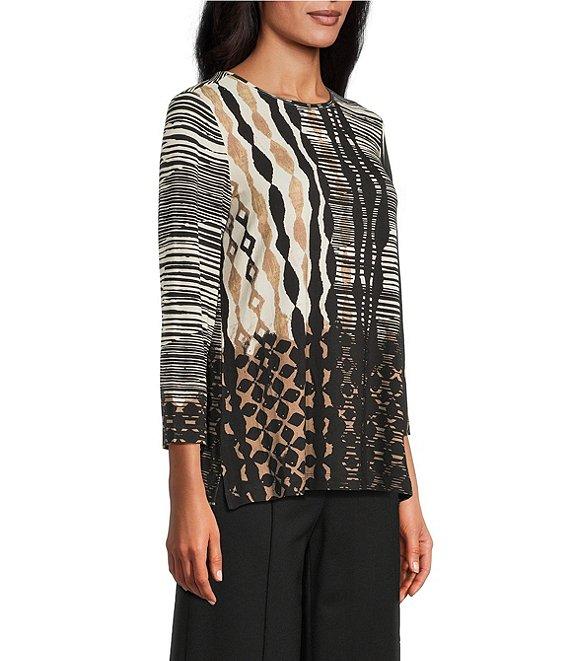 From Multiples, this top features: Stretch knit fabrication Scoop neckline 3/4 sleeves Color block, geometric, stripe pattern Fitted Straight hemline with side vents Pullover construction Approx. 26" length Rayon/spandex Machine wash/line dry Imported.
