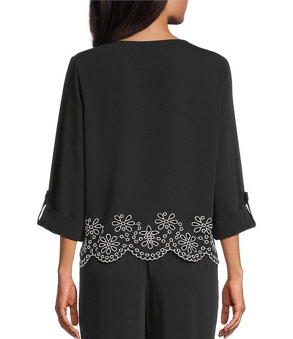 Multiples Petite Size Woven Boat Neck Long Roll-Tab Sleeve Embroidered Scalloped Hem Top
