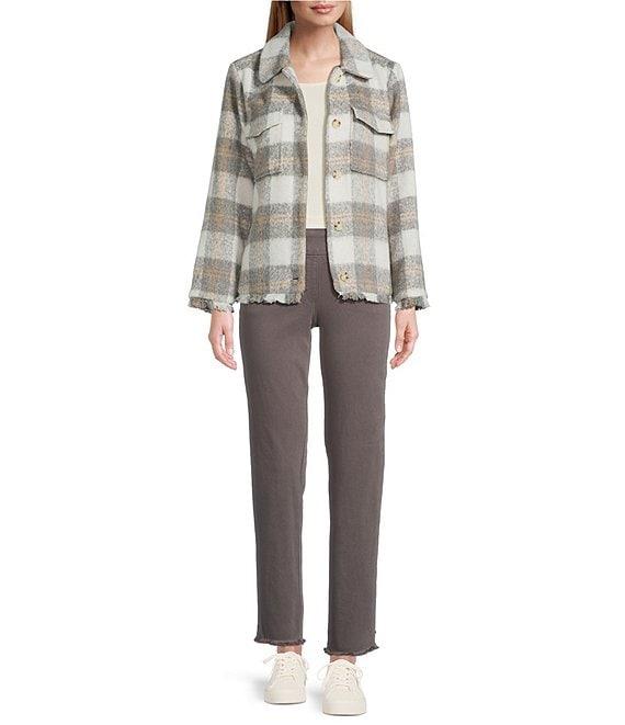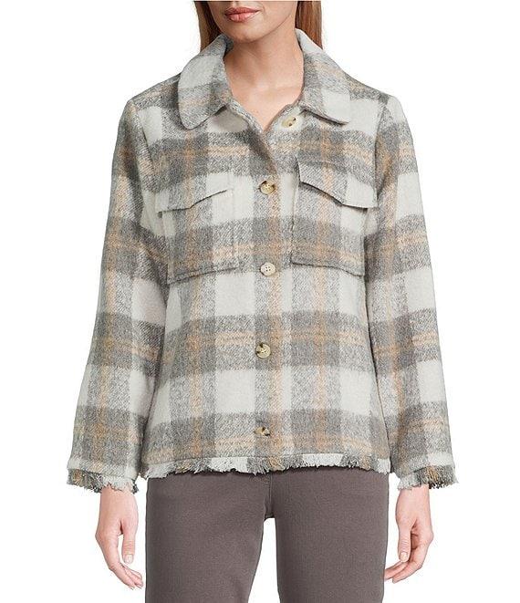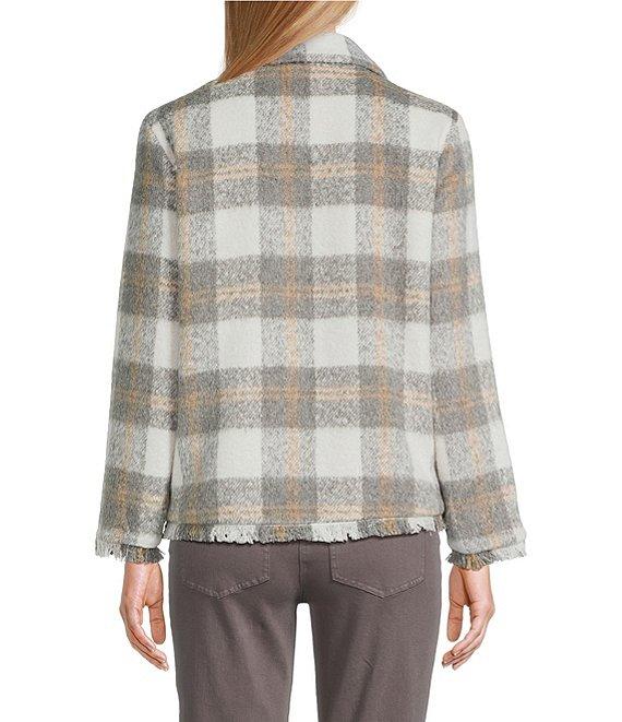 From Multiples, this jacket features: Woven fabrication Fitted silhouette Point collar Long sleeves Plaid Two front chest pockets Fringe hemline Button front closure Approx. 26" length Polyester Place in garment bag/machine wash cold Imported.