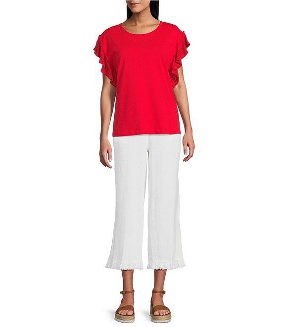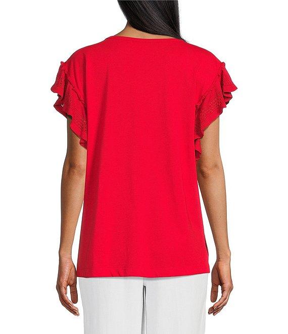 From Multiples, this top features: Solid knit jersey fabrication Scoop neckline Short flutter sleeves Fitted Contrast trim detail Hi-low hem with side slits Pullover construction Approx. 24.5" front length, 26" back length Cotton/acrylic Machine wash/line dry Imported.