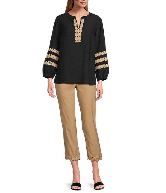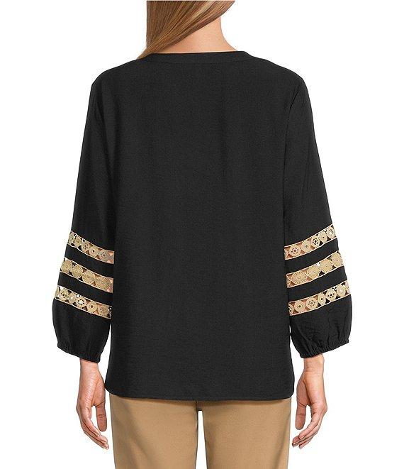 From Multiples, this top features: Woven fabrication Banded neck with notch front placket 3/4 sleeves with elastic Fitted Inset tan trim Shaped hem with side vents Pullover construction Approx. 27" length Rayon/nylon Machine wash/tumble dry low Imported.