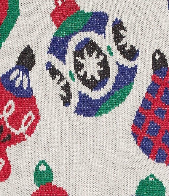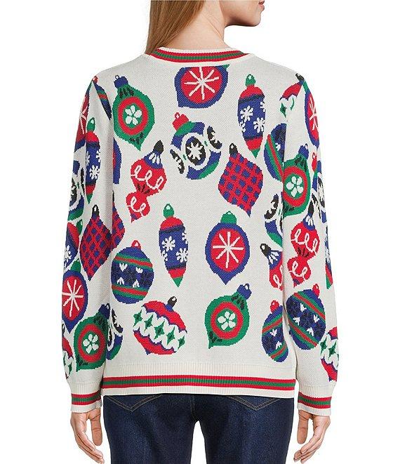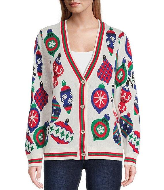 From Multiples, this cardigan features: Yarn-dye jacquard knit fabrication V-neckline Long sleeves with cuffs Ornament print Embellished detail Contrast trim Straight hem Button-front closure Approx. 25" length Acrylic/cotton Place in garment bag-machine wash cold Imported.