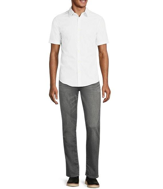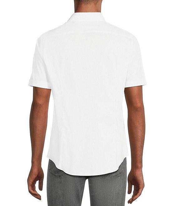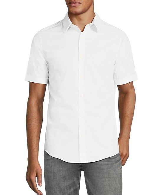 From Murano, this shirt features: Solid tone with embroidered collar Slim fit Point collar Short sleeves Button-front closure Cotton/spandex blend Machine wash/tumble dry Imported.