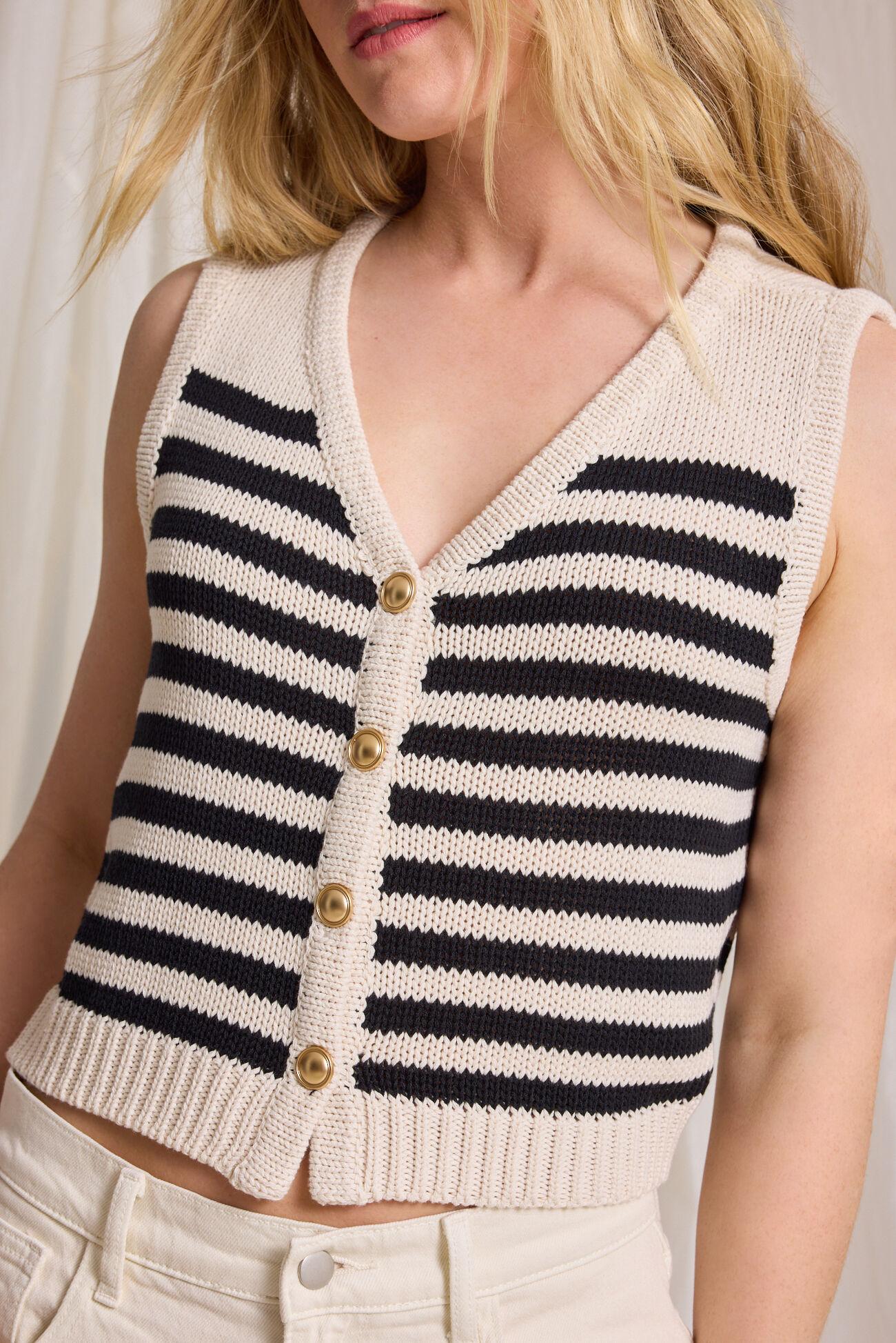 Featuring timeless stripes, this versatile piece offers endless layering possibilities. Crafted for comfort and enduring style, this sweater vest is a must-have for any well-rounded closet.