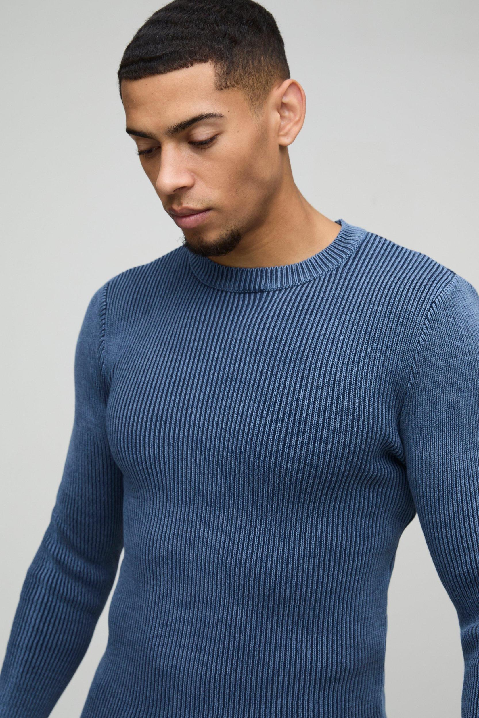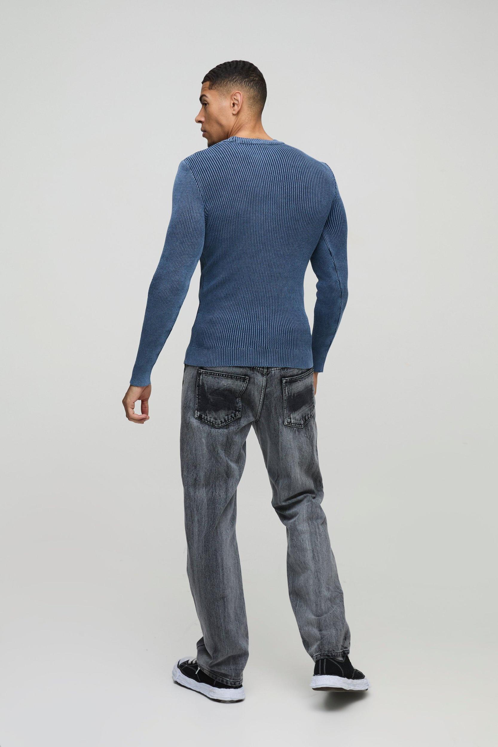Muscle Fit Ribbed Acid Wash Ribbed Knitted Sweater | boohooMAN USA