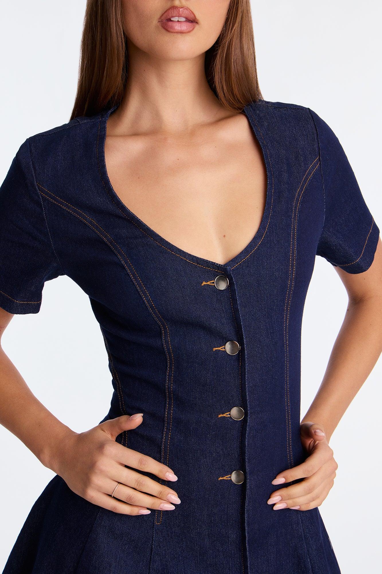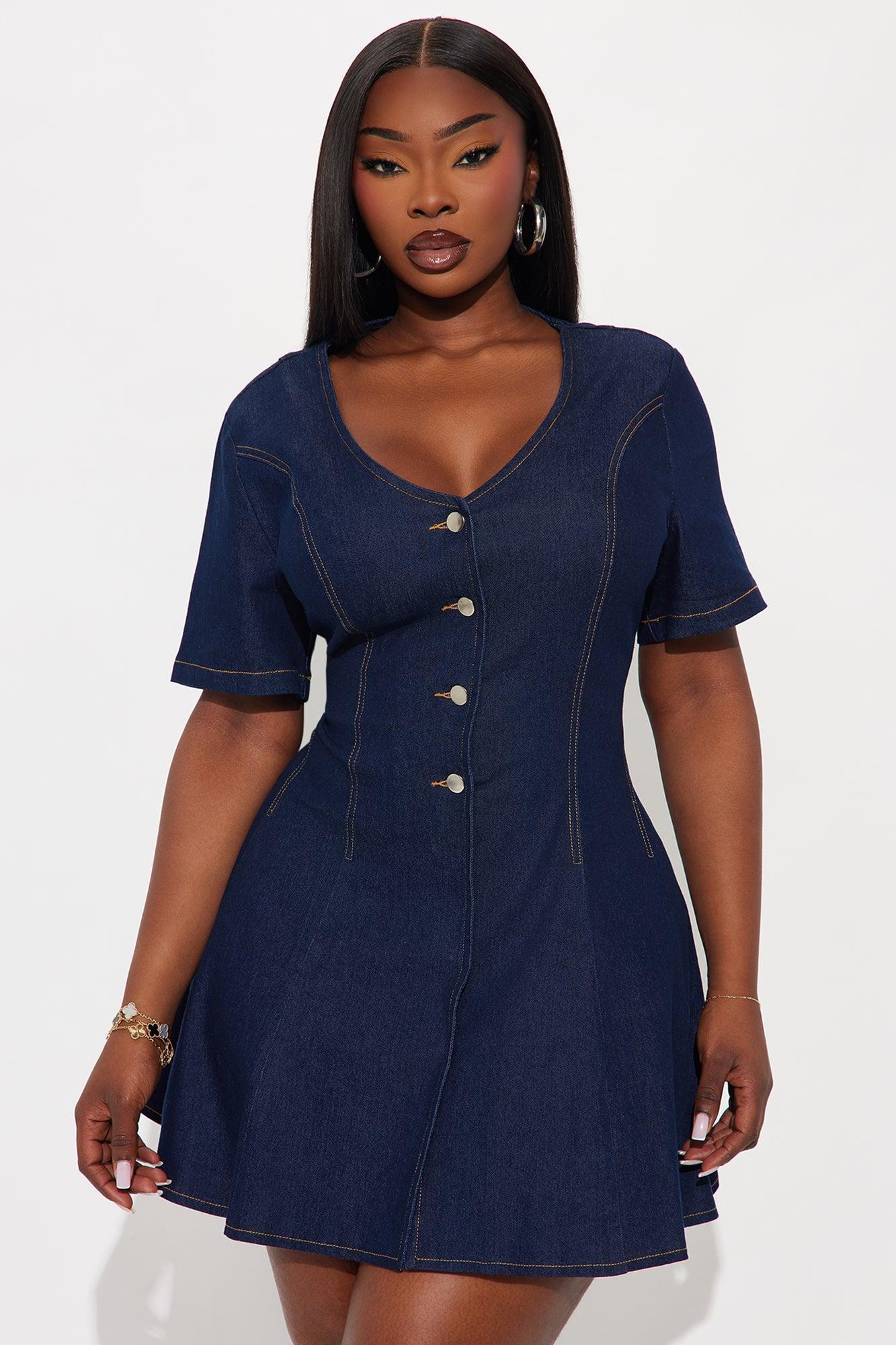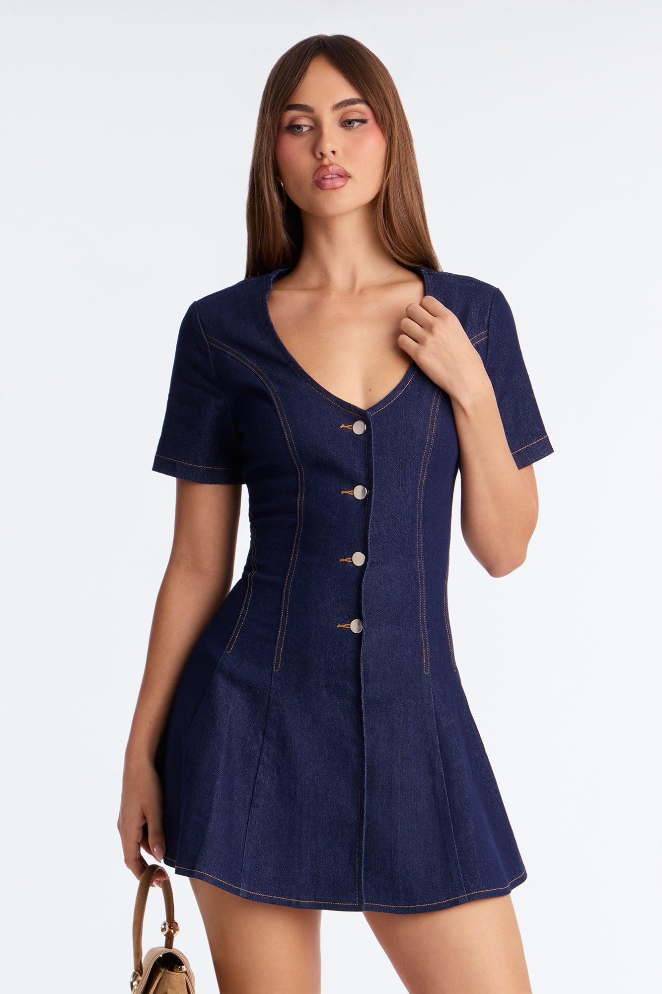 Available In Dark Denim. Denim Mini Dress V-Neck Short Sleeve Button Up Snap Button Closure Stretch Length Measured Flat = 32" Self: 75% Cotton 22% Polyester 2% Viscose 1% Spandex Imported California Proposition 65WARNING: Cancer and Reproductive Harm - www.P65Warnings.ca.gov.