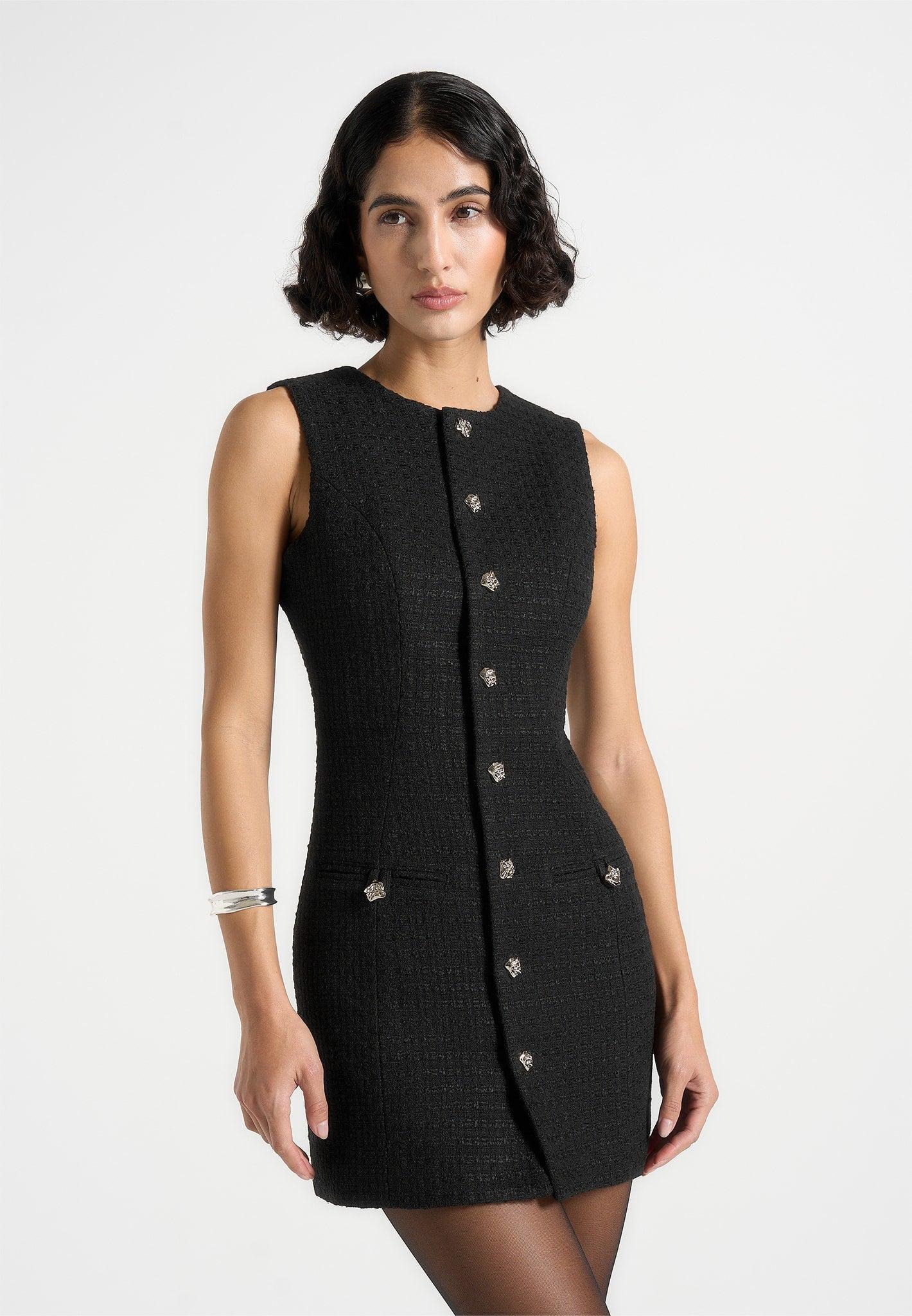 Crafted in a sophisticated woven tweed, this tailored mini dress blends texture and structure. Detailed with textured silver button accents and darted at the waist for a flattering fit, this dress is finished with a smooth satin lining for added comfort. Woven from tweed fabric for a rich texture Textured silver feature buttons to enhance the silhouette Front pockets with golden button accents for a refined, statement finish Contours the body with tailored side darting Smooth satin inner lining for enhanced comfort Sleek zip back closure with signature Manière De Voir Eiffel Zip 100% Polyester Always check the care label for wash instructions.