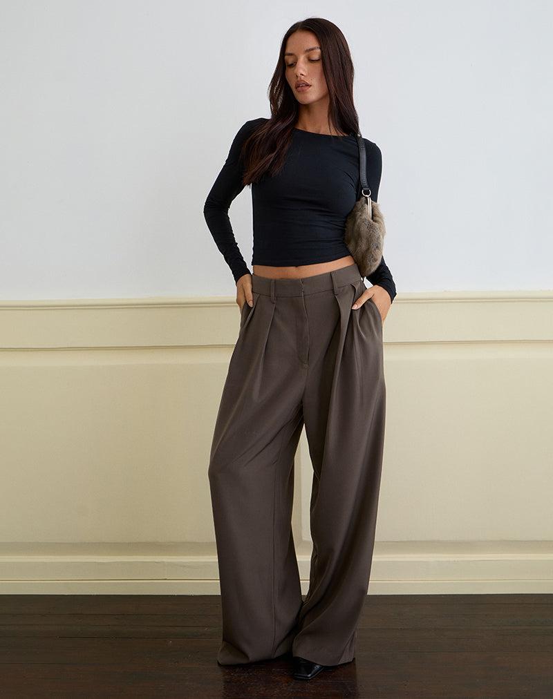 The Nala trouser in a tailored truffle fabric, features a wide-leg silhouette with soft front pleats and a relaxed mid-rise fit. Crafted from subtle check suiting. Complete the look with black Dulcet long sleeve top. MODEL WEARS SIZE: EXTRA SMALL - MODEL HEIGHT:5'7