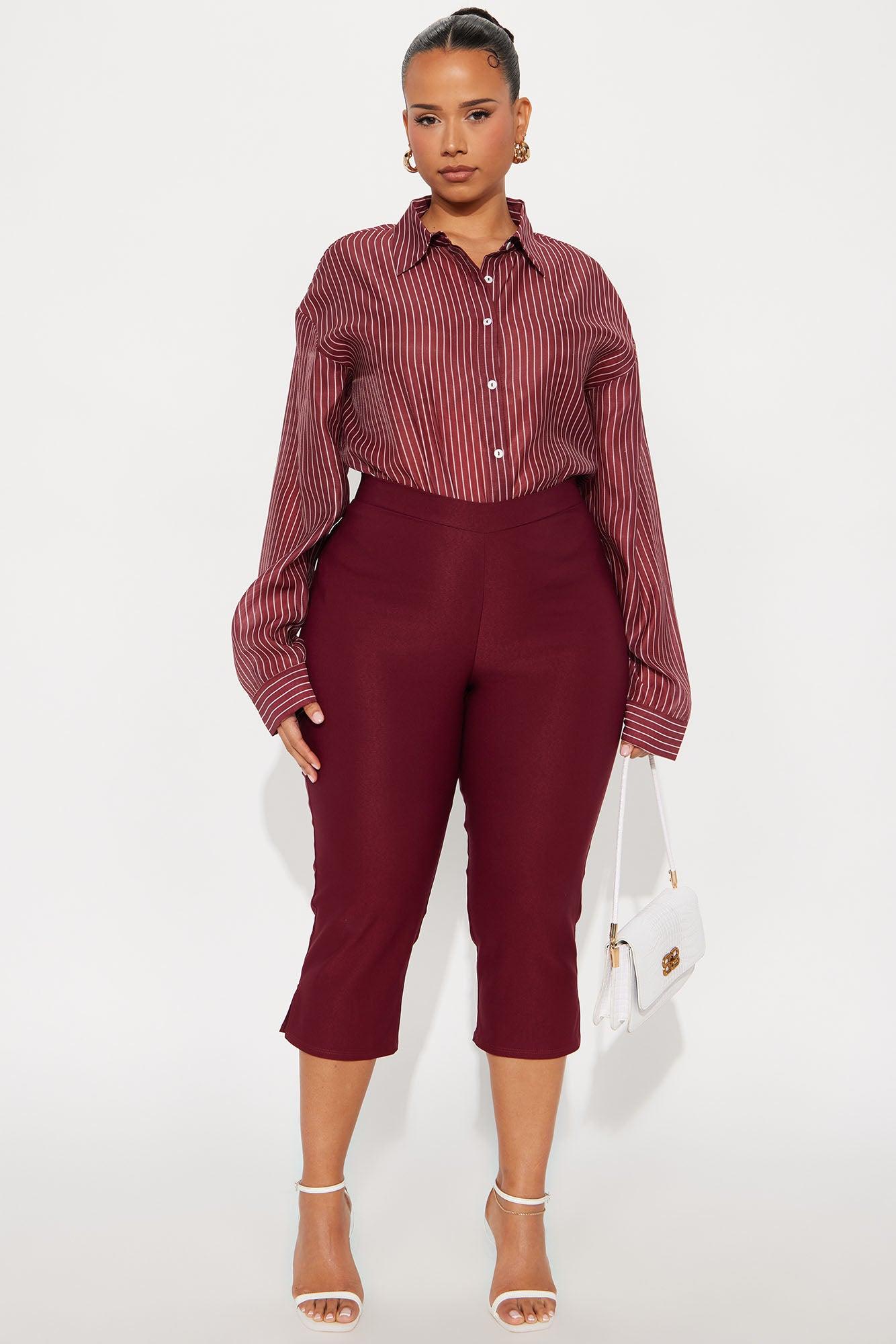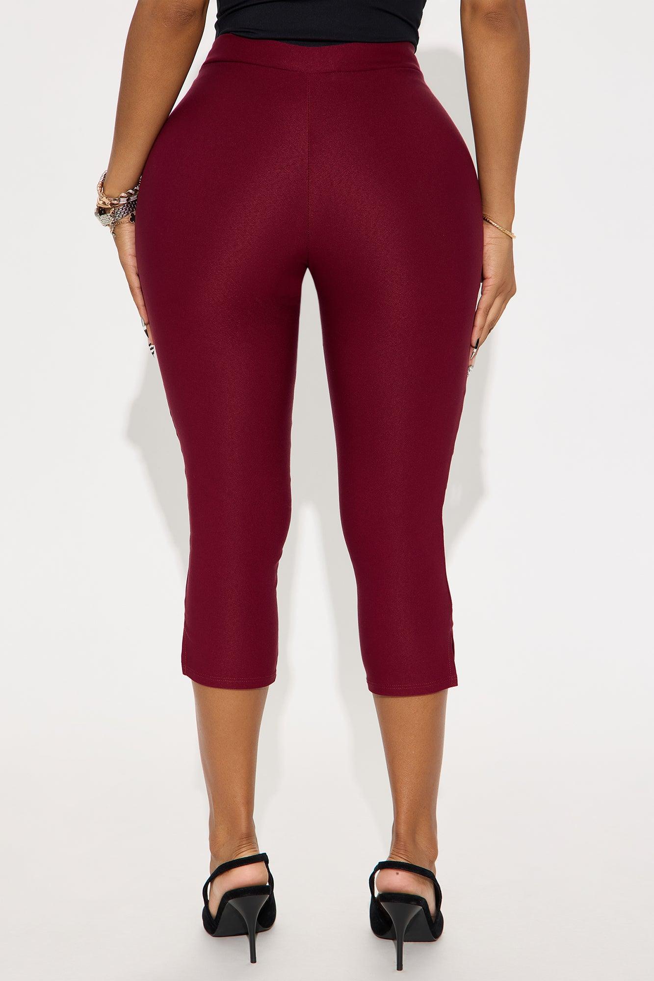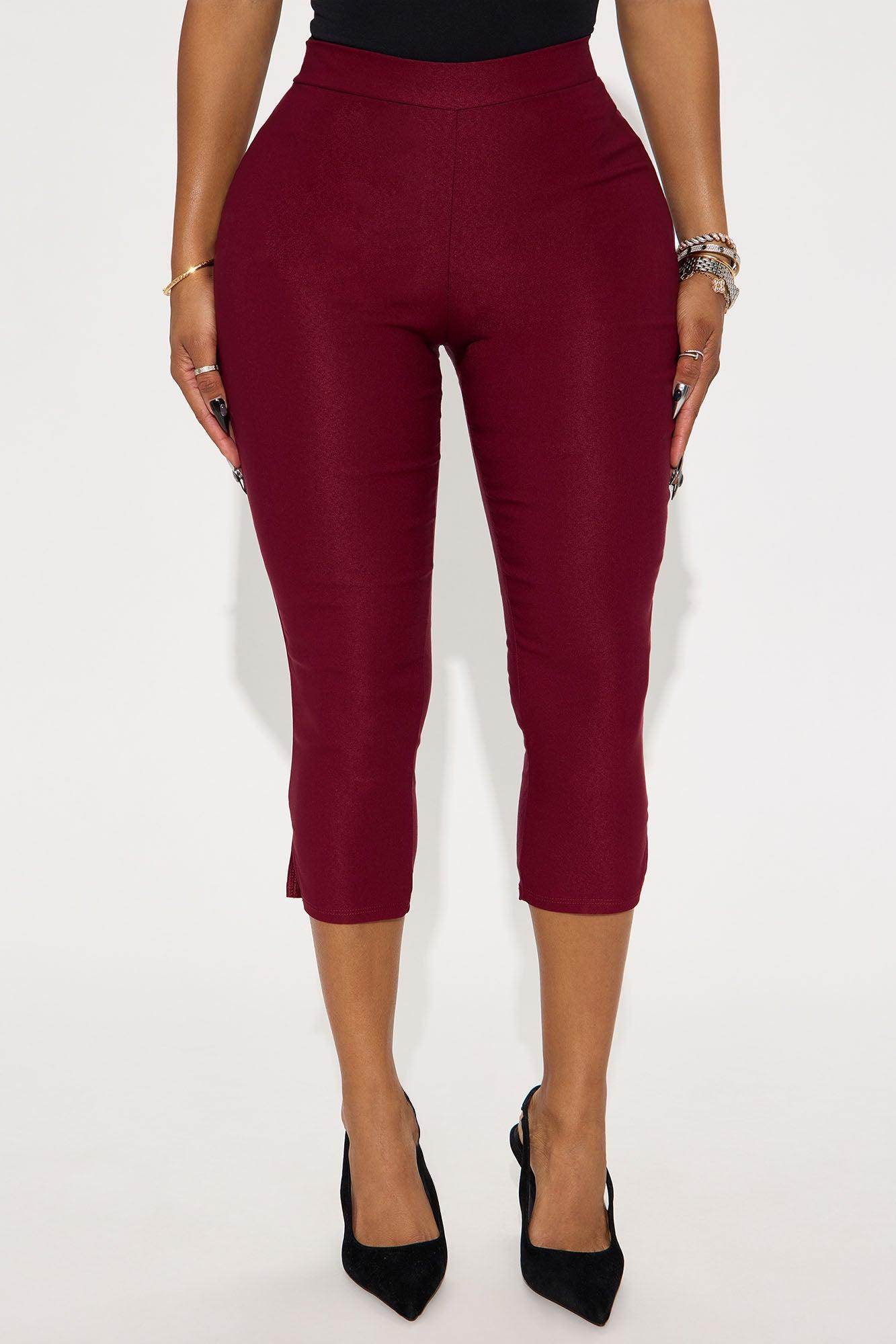 Available In Black, Burgundy, Chocolate, Navy And Olive. Skinny Capri Pant Side Zip Closure High Rise Millennium 20" Inseam Stretch Self : 74% Rayon 22% Nylon 4% Spandex Imported California Proposition 65WARNING: Cancer and Reproductive Harm - www.P65Warnings.ca.gov.