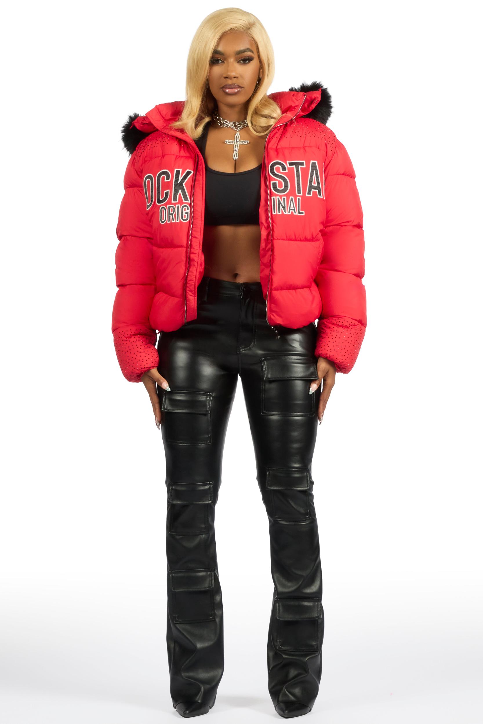 Natia Red Oversized Rhinestone Puffer Jacket Female
