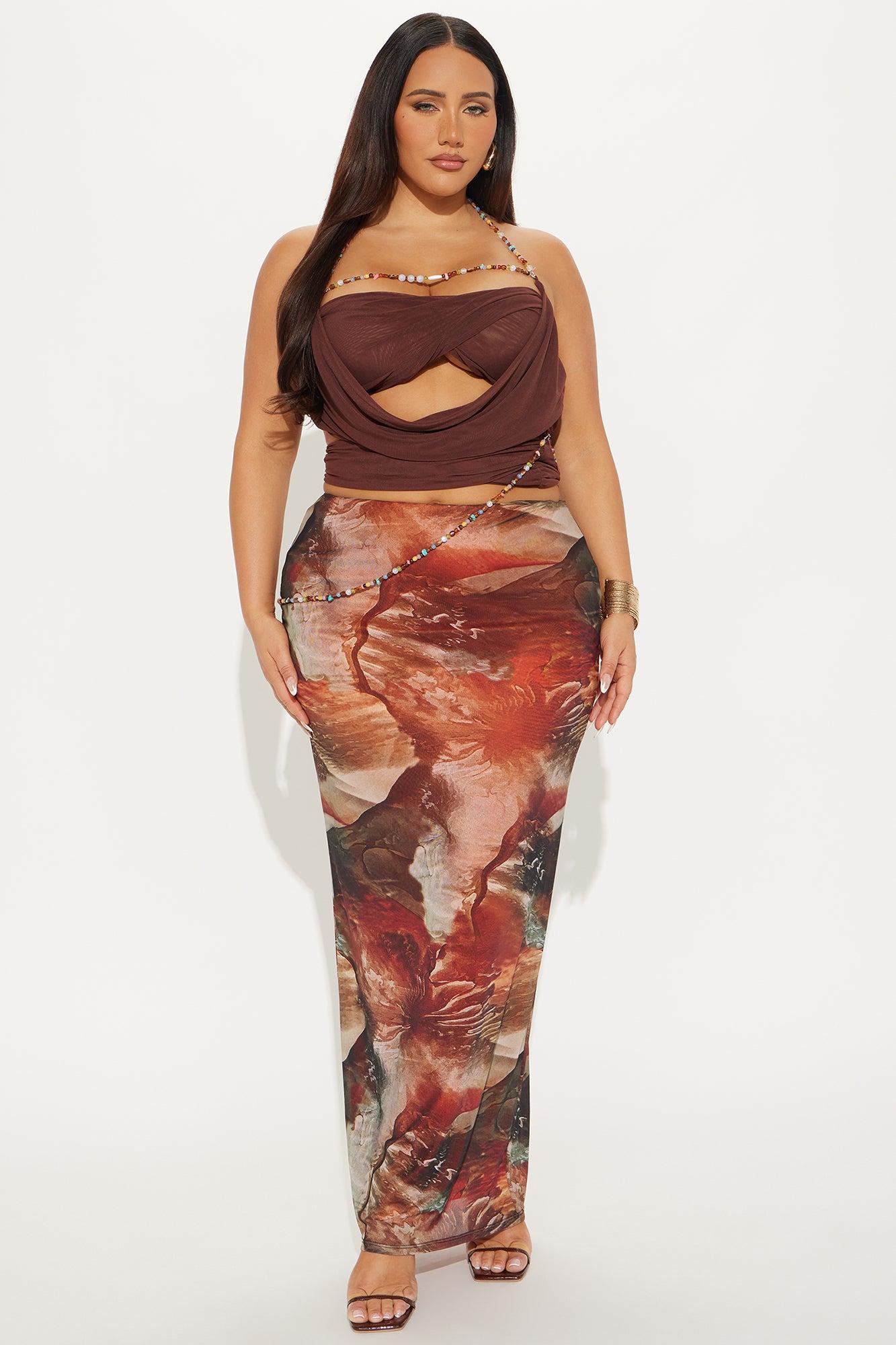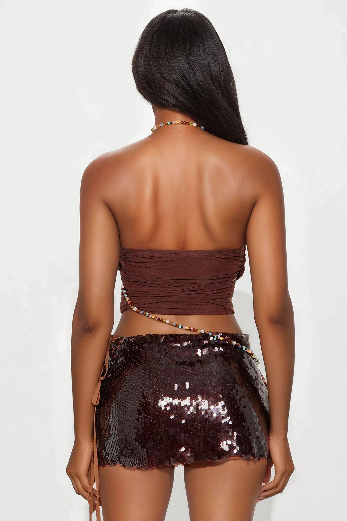 Available In Brown. Halter Top Stretch Beaded Chain Strap Cowl Neck Ruched Cut Out Beaded Embellishment Cropped Self: 95% Nylon 5% Spandex Lining: 95% Nylon 5% Spandex Imported California Proposition 65WARNING: Cancer and Reproductive Harm - www.P65Warnings.ca.gov.