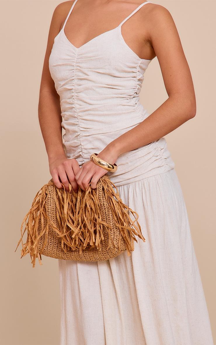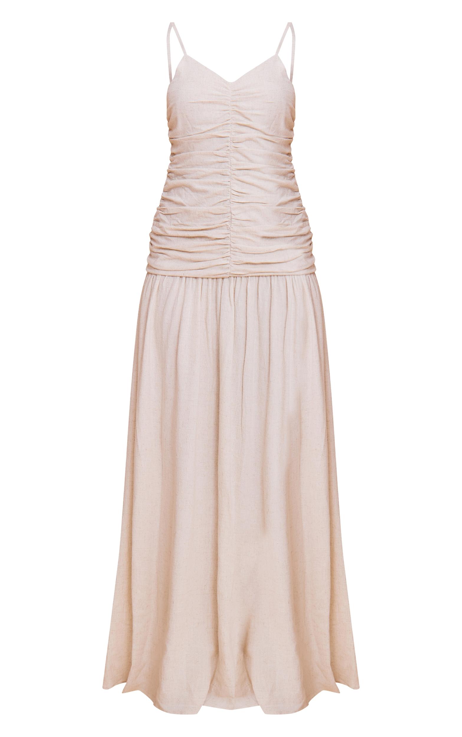 Cultivate an effortless look with a piece designed for everyday impact. The natural textured linen look woven ruched detail dropped hem maxi dress offers a refined silhouette, featuring a delicate V-neckline and slender spaghetti straps that lead into a meticulously ruched bodice, creating subtle definition before flowing into a relaxed dropped hem maxi skirt. This natural-hued dress is ideal for those sun-drenched moments; complete the look with flat sandals and minimalist gold jewelry for a refined yet relaxed day vibe that champions confident ease.Length approx 155cm/61inch (Based on sample size US 4)Model wears size UK 8/ EU 36/ AUS 8/ US 4Model Height - 5ft 7inchp]:!mb-4inch>Brand: PrettyLittleThingCategory: DressesProduct type: Shift DressColor: NaturalMaterial: Woven CrepeNeckline: V NeckSleeves: Spaghetti StrapOccasion: Day